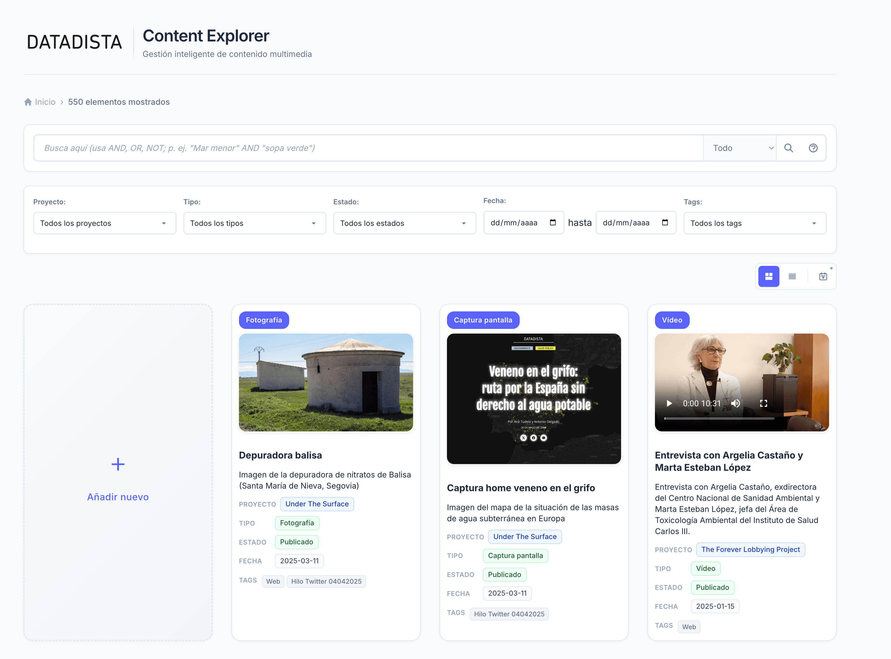 Después de más de nueve años, desde que nació DATADISTA, viajando por España para contar las historias humanas detrás de los datos, los desastres medioambientales sobre el terreno y a vista de dron, después de documentar con una cámara agarrada al morro de la moto el estallido de la burbuja inmobiliaria en la costa, de probar los daños al Mar Menor, a las Tablas de Daimiel, a Doñana, de volar alrededor de las macrogranjas en Aragón y de hacer decenas y decenas de entrevistas a quienes sufren lo que cuentan los datos y los mapas, tenemos un tesoro en imágenes que es historia de este país. Y como pretendemos seguir contándola, necesitamos poder reutilizar esas imágenes con facilidad. Estamos muy contentos con el resultado.