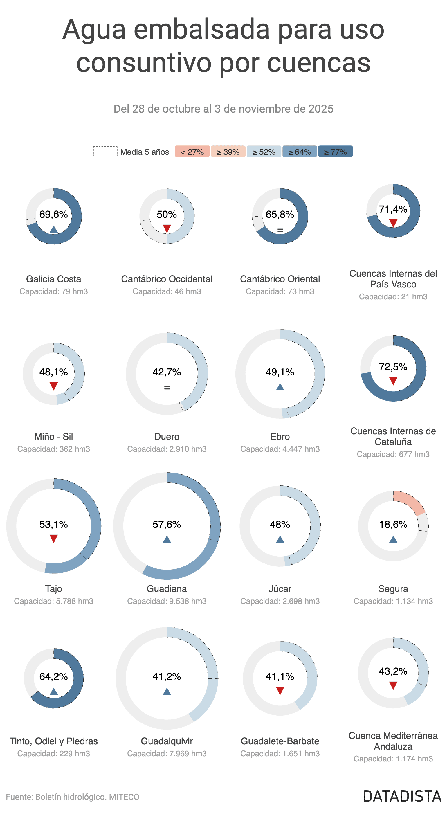 Las Cuencas Internas del País Vasco registran el mayor descenso de la semana, caen 4,8 puntos y se quedan en el 71,43% con 15 hm³. El Cantábrico Occidental baja 2,2 puntos hasta el 50,00% con 23 hm³. Le sigue el Miño-Sil, que pierde 1,9 puntos y se sitúa en el 48,07% con 174 hm³. Las Cuencas Internas de Cataluña retroceden 0,6 puntos hasta el 72,53% con 491 hm³. La Cuenca Mediterránea Andaluza desciende 0,3 puntos hasta el 43,19% con 507 hm³. El Tajo baja 0,2 puntos y queda en el 53,14% con 3.076 hm³. Guadalete-Barbate registra el descenso más leve, 0,1 puntos, y se sitúa en el 41,13% con 679 hm³.