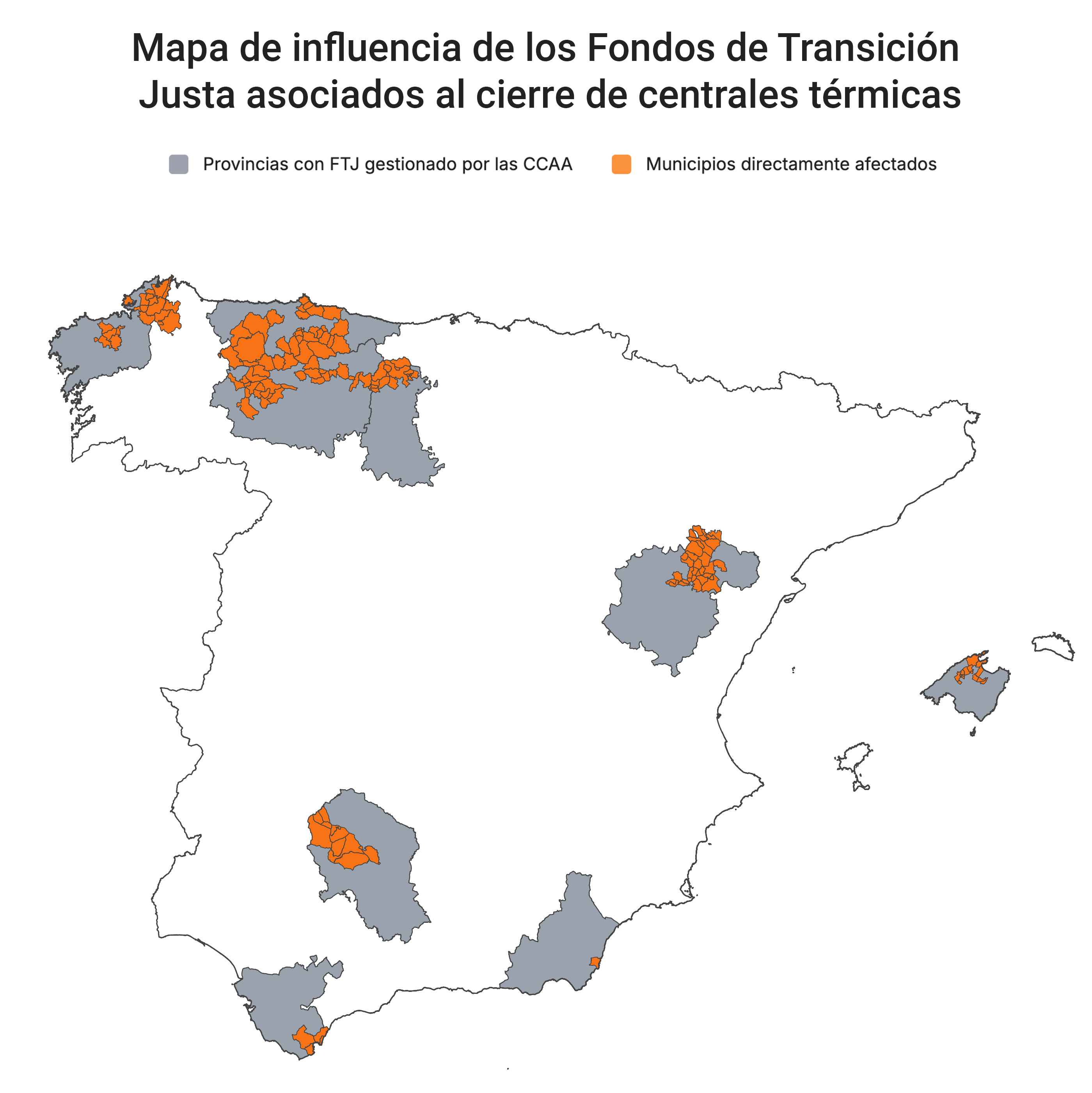 Aunque existen 197 municipios repartidos en 15 zonas de transición justa, incluyendo los afectados por el cierre de minas de carbón, centrales térmicas y las nucleares de Garoña y Zorita, la mayor parte del dinero se ha repartido a escala provincial, como exigía Europa y como acordaron el Estado y las comunidades. Así se seleccionaron Asturias, León, Palencia, A Coruña, Cádiz, Córdoba, Almería, Teruel y Mallorca, por tener instalaciones cerradas o en cierre y una situación previa de paro y despoblación. Ese trazo grueso ha dejado fuera a municipios limítrofes que sí sufren el cierre, pero no aparecen en el mapa del dinero ni siquiera para poder optar a él. Pero incluso los que están dentro de la zona que puede recibir dinero, no lo están recibiendo.
