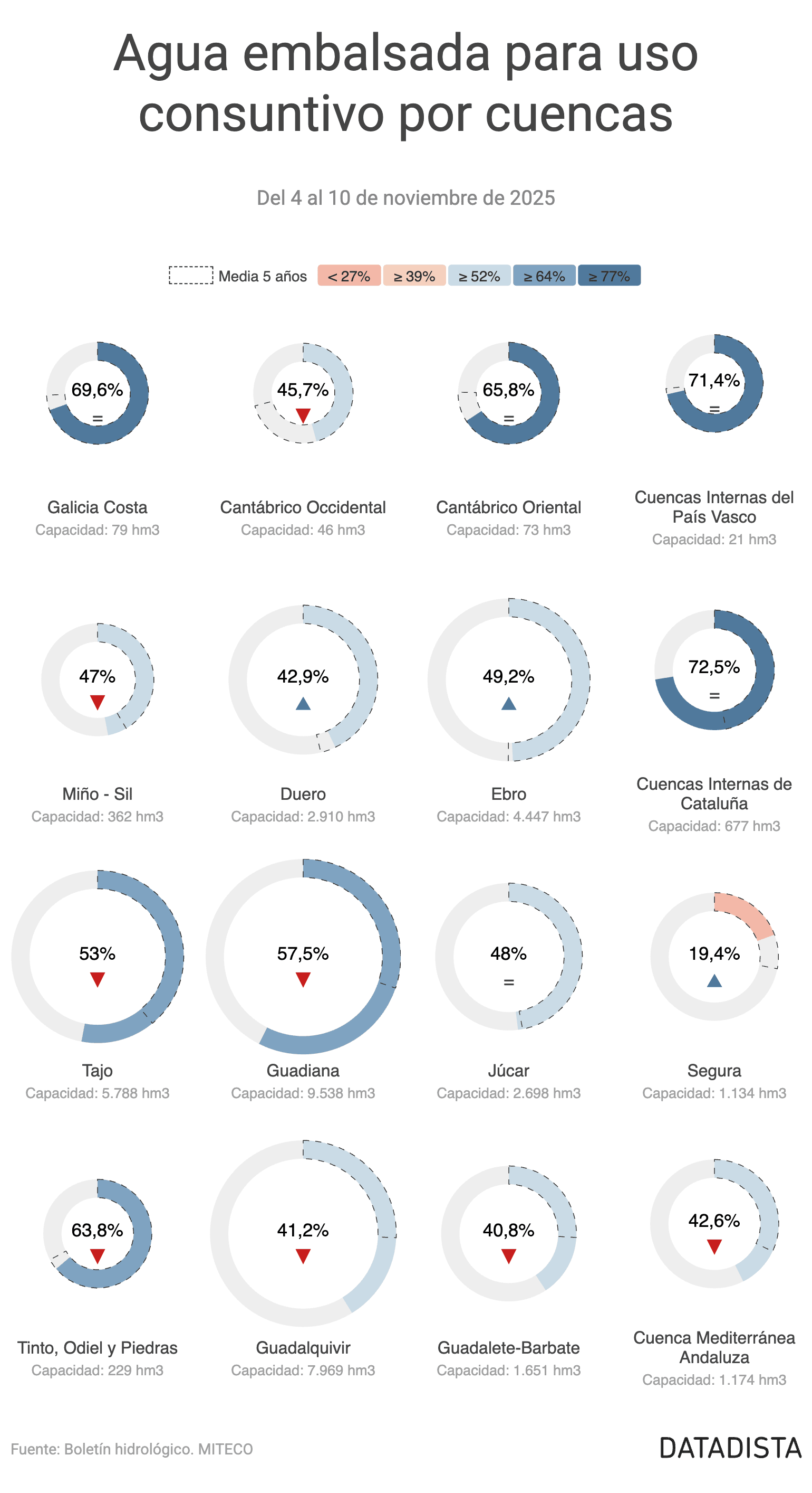 Esta semana, los mayores descensos del agua embalsada para uso consuntivo se han dado en algunas cuencas del norte de España. El Cantábrico Occidental presenta la mayor caída, con una reducción de 8,7 puntos, situándose en un 45,7% de su capacidad con 21 hm³. Le sigue Miño-Sil con una disminución de 2,3 puntos y un porcentaje actual del 47,0% con 170 hm³.