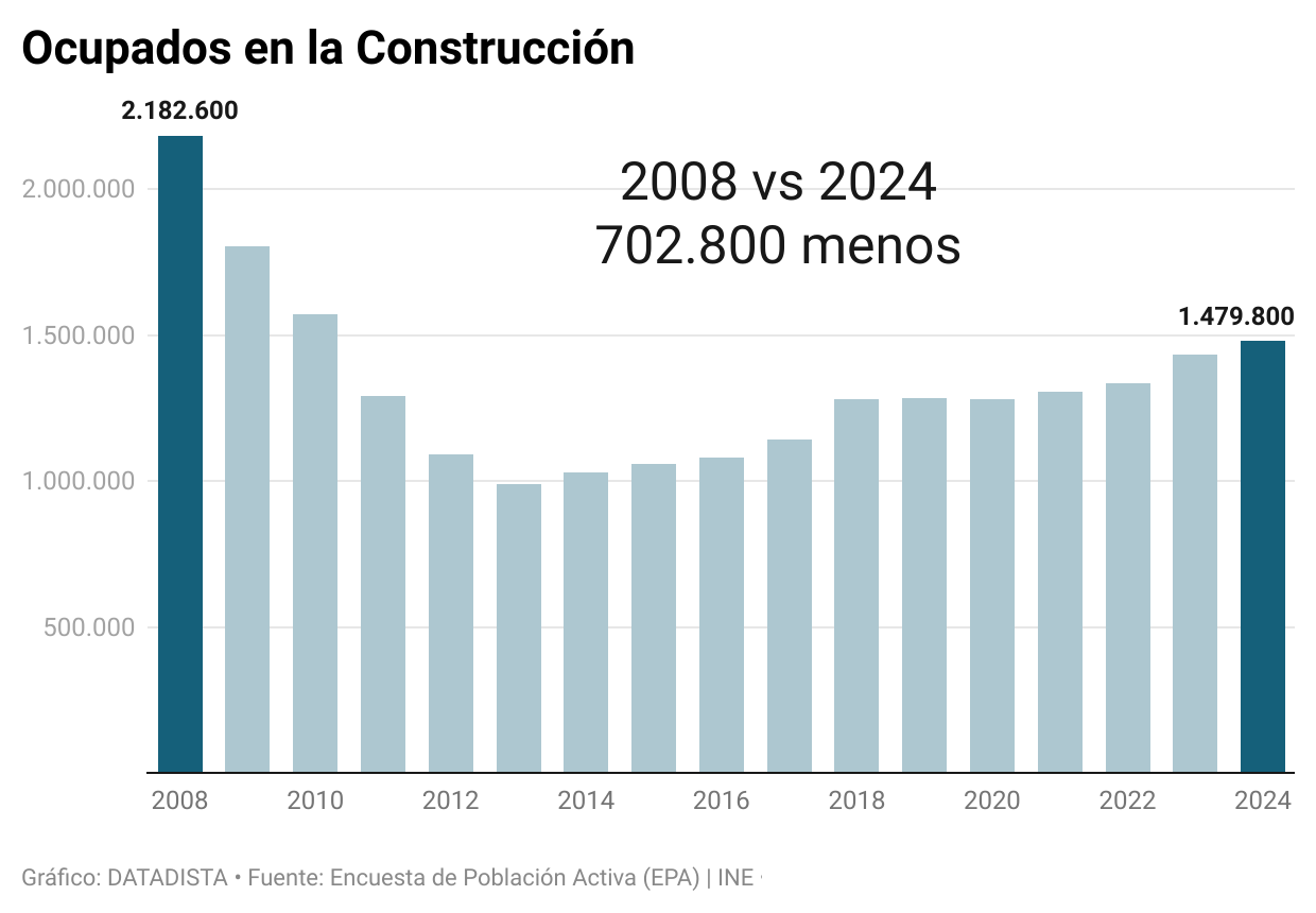 El año pasado hubo de media 702.800 trabajadores menos en el sector de la construcción respecto a 2008. ¿Hay que volver a aquellas cifras? La opinión es cosa tuya pero aquí recordamos que el peso que se dio a la construcción en la economía, el empleo y el crédito tuvieron mucho que ver con el desastre que vino después. Pero dado el estancamiento de vivienda nueva, la patronal de la construcción cifra en esos 700.000 empleos los que harían falta para responder de la demanda acumulada.