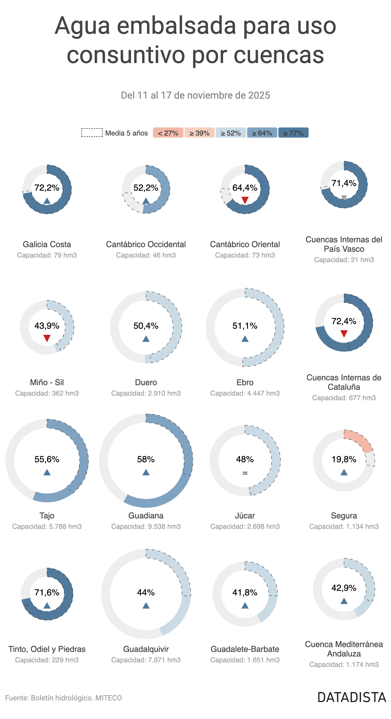 Analizando las variaciones por cuencas en los embalses consuntivos, la cuenca del Miño-Sil ha experimentado una disminución de 6,5 puntos, situándose en un 43,9% con un volumen de 159 hm³. Cantábrico Oriental también ha disminuido 2,1 puntos, con un 64,4% y 47 hm³.