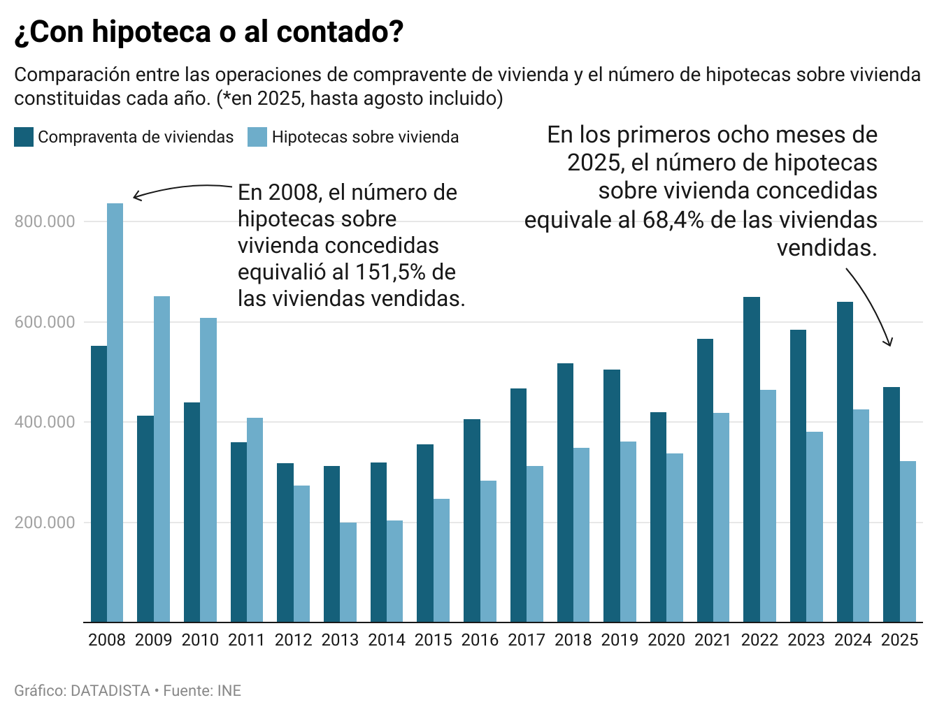 Si en 2008 el número de hipotecas sobre vivienda constituidas equivalió al 151,5% de las operaciones de compraventa de vivienda, es decir, se hipotecaban casas sin operaciones de compraventa de por medio, viviendas que ya se tenían en propiedad, en los primeros ocho meses de 2025 el número de hipotecas sobre vivienda equivalió al 68,4% de las operaciones. Es decir, hay un amplio número de compraventas que se están haciendo al contado, lo que permite intuir que las viviendas se están concentrando en manos de quienes tienen una capacidad de adquisición suficiente para no tener que financiar la compra, ya sean personas o entidades jurídicas.