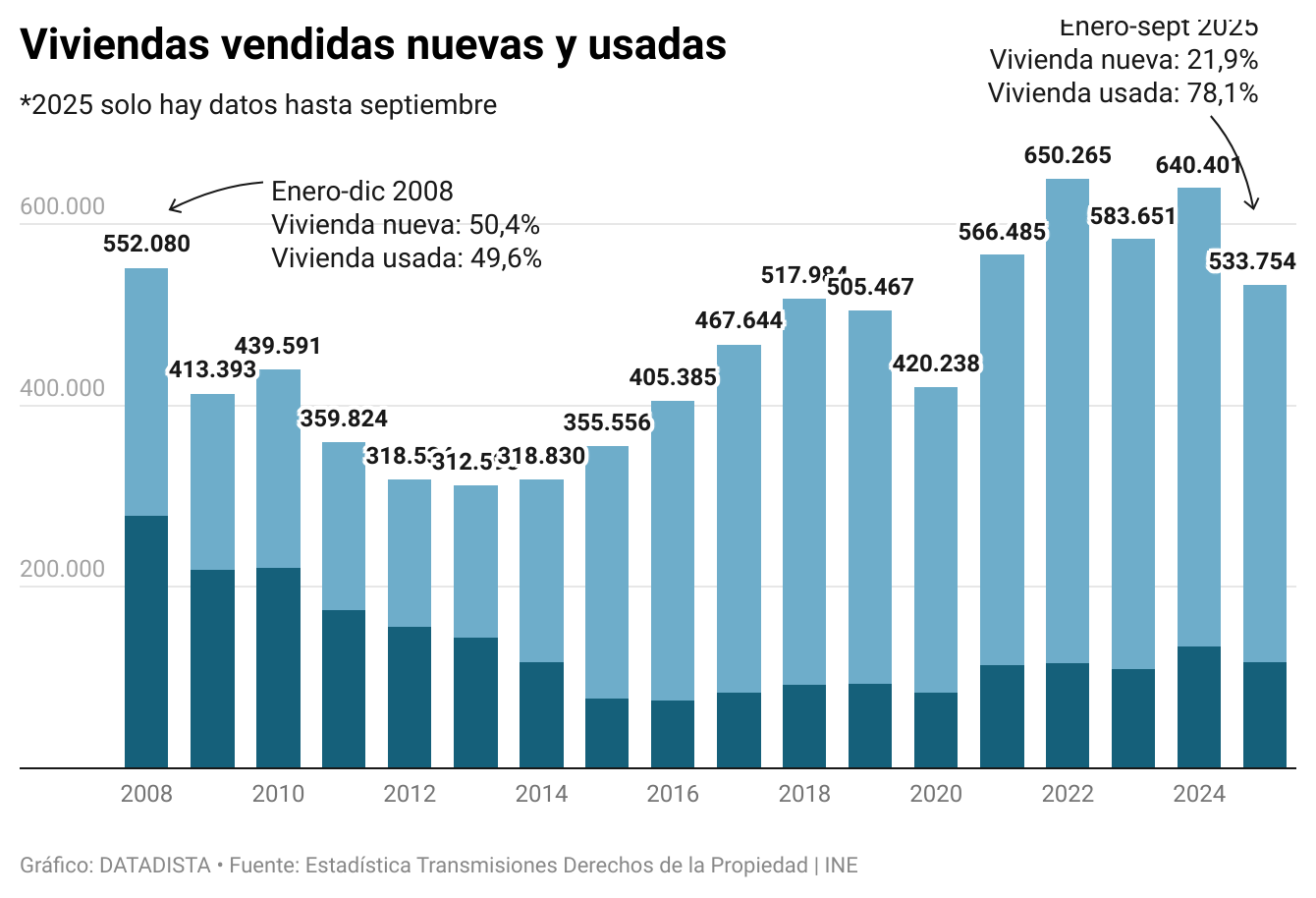 Si en el momento del estallido de la burbuja, la venta de viviendas estaba repartida más o menos a partes iguales entre vivienda nueva y usada, desde 2015, el porcentaje de vivienda nueva sobre el total de vivienda comprada está en torno al 20%. En los primeros nueve meses de 2025 fue del 21,9%. Es decir, la gran mayoría de las transacciones de vivienda se están haciendo con casas de segunda mano.