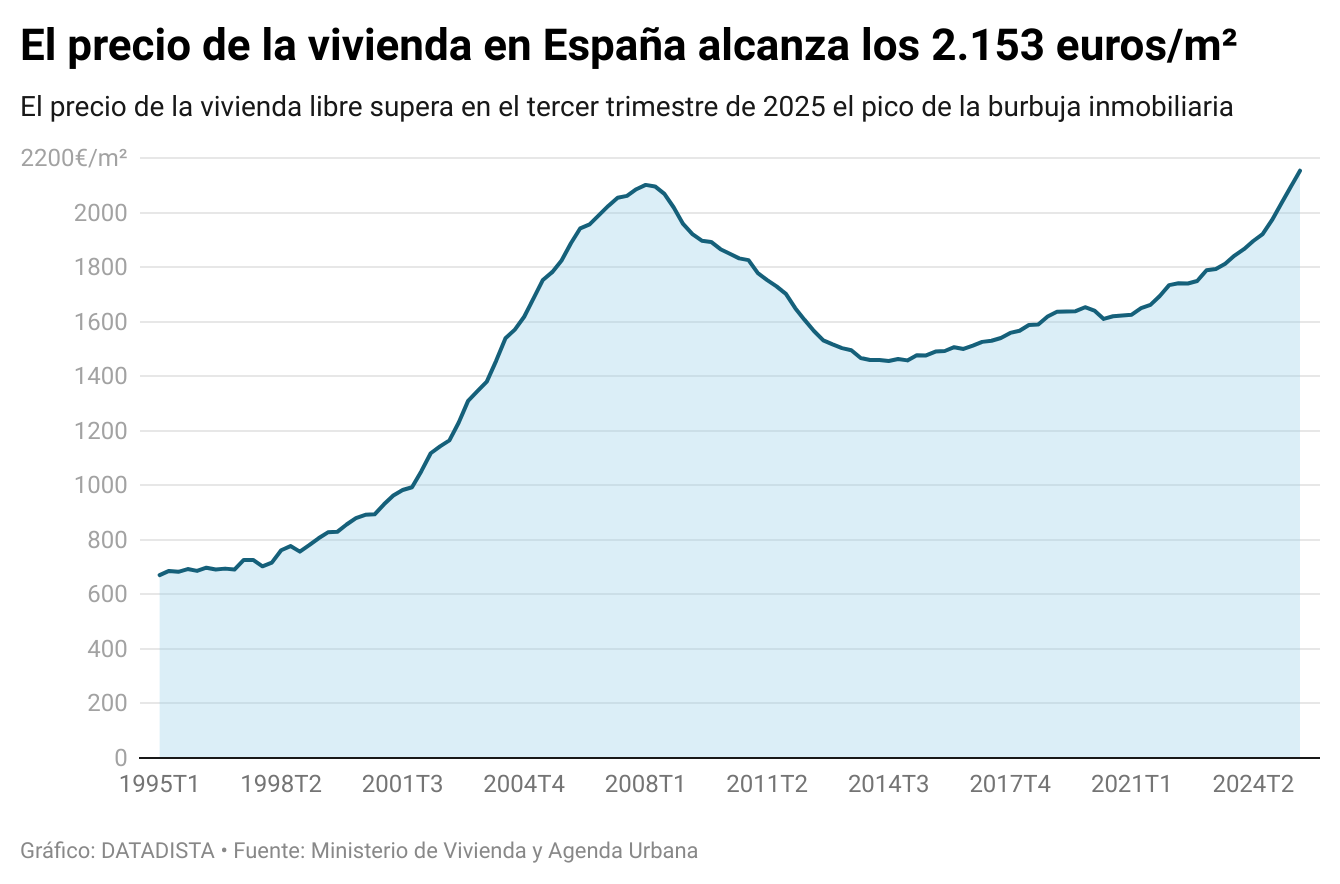 El precio medio de la vivienda libre se ha situado en el tercer trimestre de 2025 en 2.153,4 euros por m². Ha subido un 12,1% respecto al tercer trimestre del año anterior y supera el precio de la burbuja inmobiliaria, registrado en el primer trimestre de 2008, cuando el precio alcanzó los 2.101 euros por m², según las estadísticas de tasaciones publicadas esta semana por el Ministerio de Vivienda y Agenda Urbana.