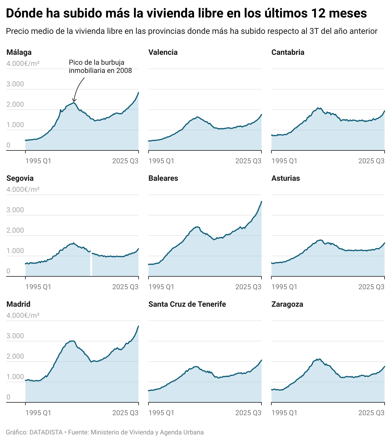 Como puedes ver en los gráficos, hay regiones donde hace tiempo que se superó ese pico de la burbuja en los precios de la vivienda libre. Baleares superó el pico de la burbuja en 2021 y Madrid lo hizo en 2023, mientras que Málaga y Valencia han rebasado ese umbral más recientemente, en 2024 y 2025, respectivamente. En cambio, provincias como Cantabria, Segovia, Asturias o Zaragoza aún no han llegado a los máximos de 2008, aunque en el último año sus precios se han disparado, con incrementos interanuales de entre el 13,8% y el 15,1%.