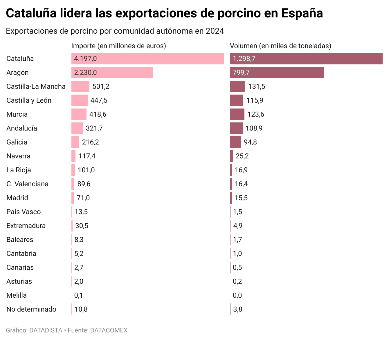 Cataluña encabeza tanto el valor como el volumen, con casi la mitad del total nacional, mientras que Aragón actúa como el segundo gran polo exportador. Entre ambas suman el 73% del valor económico y el 76% de las toneladas, lo que deja al resto de comunidades en un segundo escalón mucho más fragmentado.