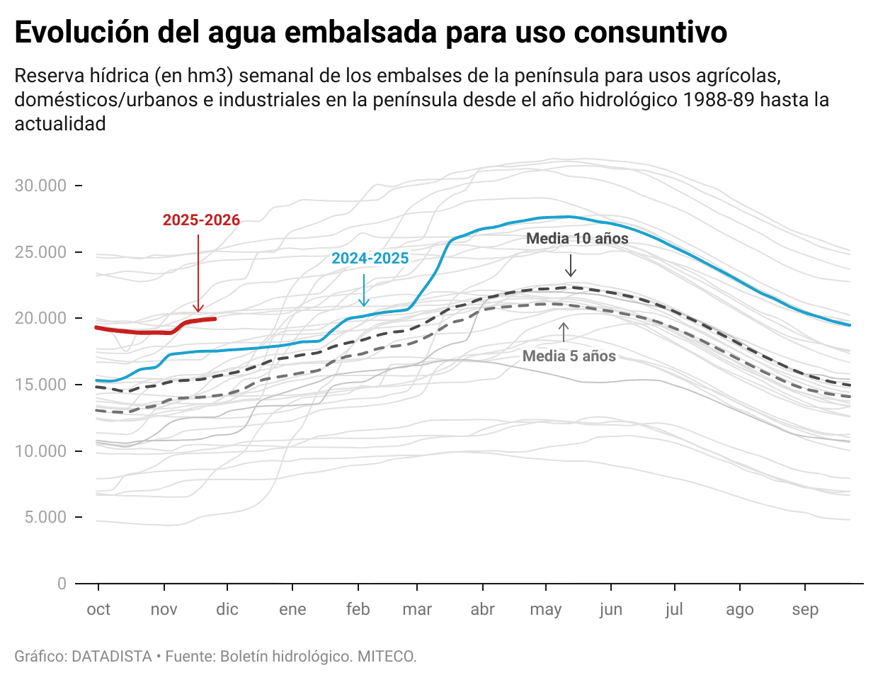 En los embalses consuntivos de España, el agua embalsada para uso humano, agrícola e industrial se sitúa esta semana al 51,4% de su capacidad, con un volumen de 19.952 hm³. Esta semana se ha producido un incremento de 95 hm³, lo que supone una subida de 0,2 puntos respecto a la semana anterior. Este volumen representa 14,8 puntos más que la media de los últimos cinco años, que se sitúa en 14.160 hm³.