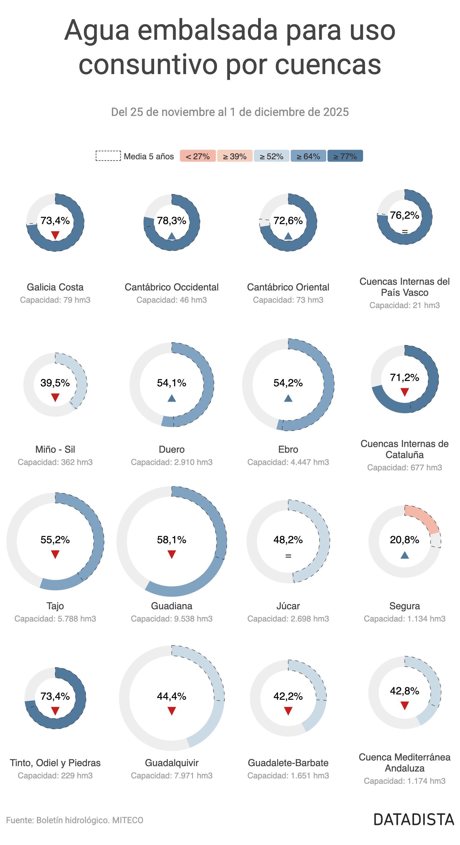 Por cuencas, la mayor bajada semanal se ha producido en Miño-Sil, con una disminución de 4,7 puntos y un volumen actual de 143 hm³, situándose en el 39,5%. Galicia Costa ha descendido 1,7 puntos hasta el 73,4%, con 58 hm³. Las Cuencas Internas de Cataluña han bajado 1,0 puntos y cuentan con 482 hm³, lo que representa el 71,2%. El Tajo ha registrado una variación de -0,8 puntos, con un volumen de 3.196 hm³ y un porcentaje del 55,2%. En Tinto, Odiel y Piedras, la variación ha sido de -0,6 puntos, alcanzando el 73,4% con 168 hm³.