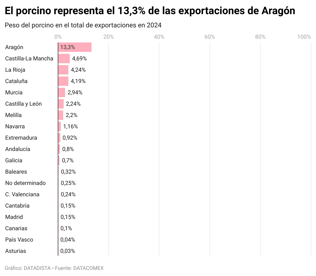 Con respecto al peso del sector en la economía regional, destaca Aragón, donde el 13,3% de todas sus exportaciones durante 2024 correspondieron al porcino.