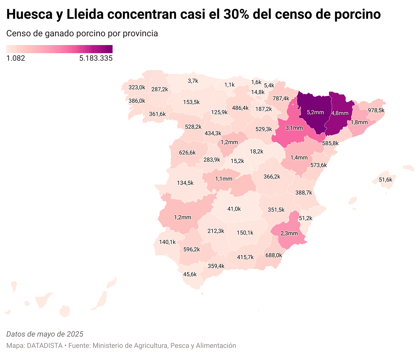 A nivel provincial, Huesca y Lleida conforman el gran núcleo del sector: suman 9.943.208 animales, el 29,4% del censo total de cerdos en España.