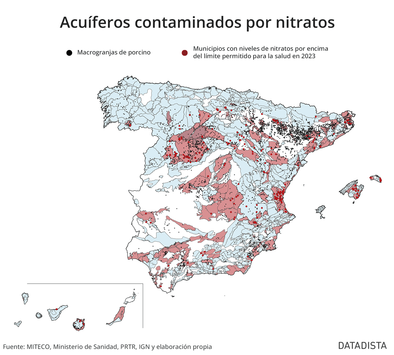 En este mapa puedes observar tres variables: la situación de las masas de agua subterráneas contaminadas por nitratos, la ubicación de las explotaciones de porcino de mayor tamaño y los municipios que en algún momento del año 2023 dieron niveles de nitratos por encima de 50 mg/l, el límite máximo permitido para la salud.