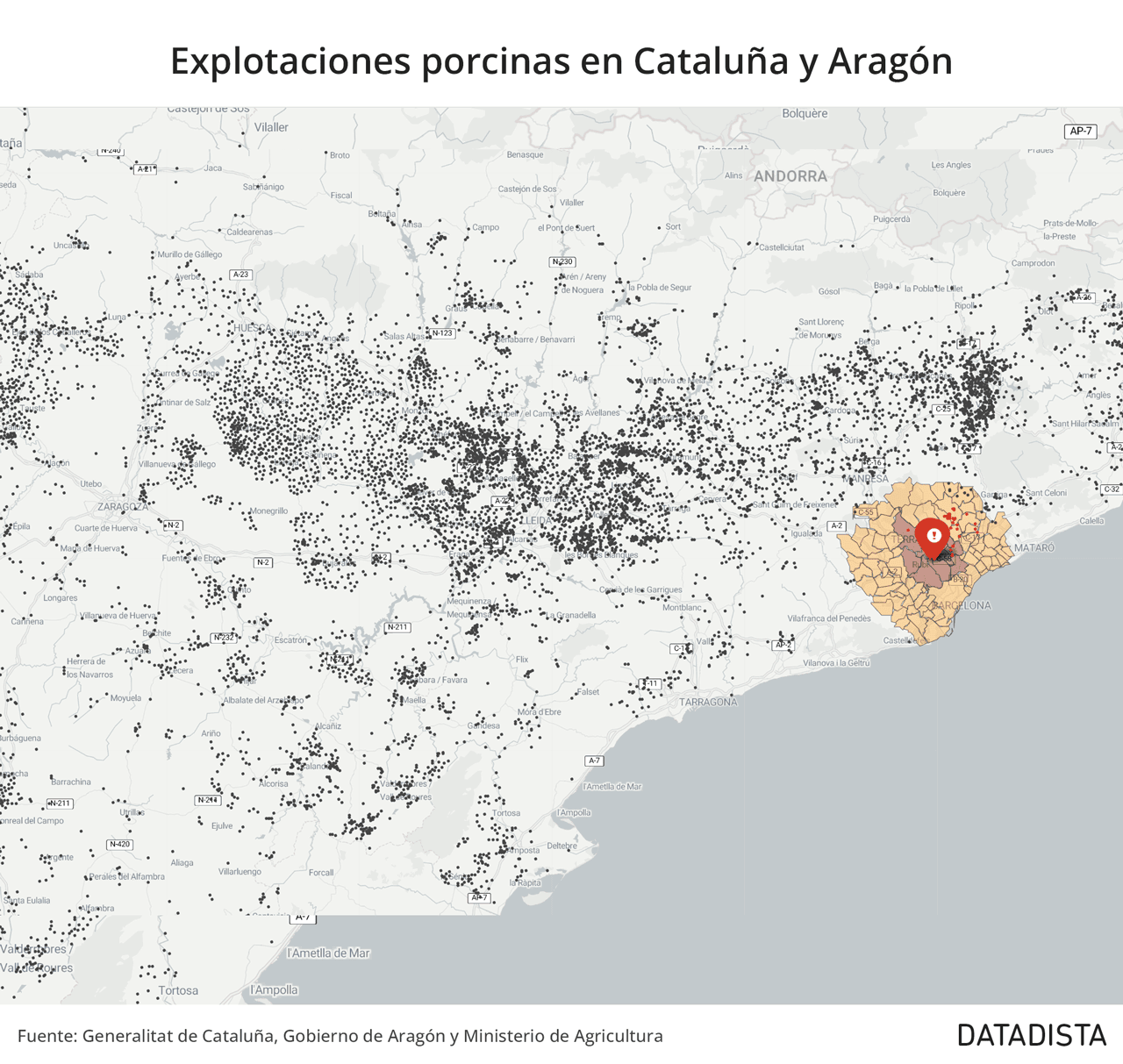 Esta concentración geográfica también se refleja en el número de macrogranjas (las instalaciones de mayor tamaño obligadas a declarar sus emisiones contaminantes a Europa). El 60% de estas grandes explotaciones industriales se encuentran situadas en Aragón y Cataluña.