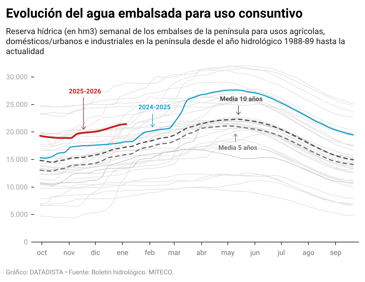 En los embalses consuntivos de España, el agua embalsada para uso humano, agrícola e industrial se sitúa esta semana al 55,3% de su capacidad, con un volumen de 21.456 hm³. Esta semana se ha producido un incremento de 150 hm³, lo que supone una subida de 0,4 puntos respecto a la semana anterior. Este volumen representa 14,2 puntos más que la media de los últimos cinco años, que se sitúa en 15.917 hm³.