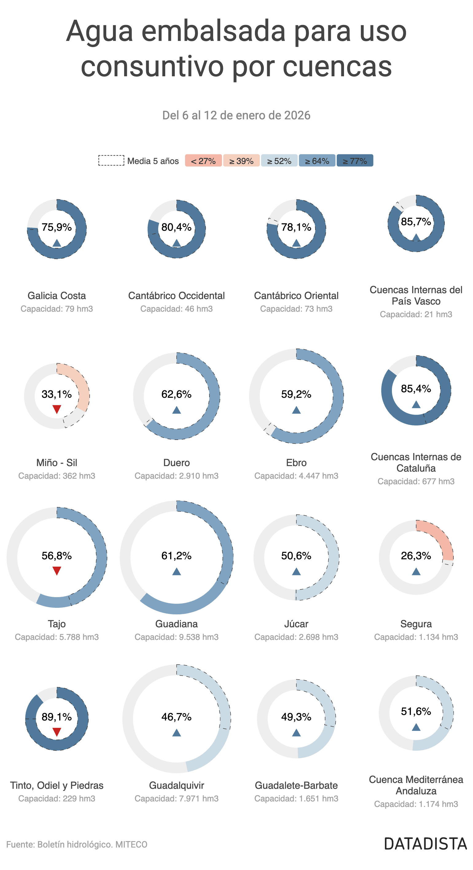 Esta semana, el descenso más acusado lo protagoniza Miño-Sil, que se desploma 8,4 puntos hasta caer al 33,1% de su capacidad. En el extremo opuesto destaca el Cantábrico Oriental, que registra la mayor subida de la semana (+9,6 puntos) impulsando sus reservas hasta el 78,1%. En cuanto a las situaciones de mayor escasez, la cuenca del Segura se mantiene a la cola con un 26,3%, seguida por el Guadalquivir, que se encuentra al 46,7%.
