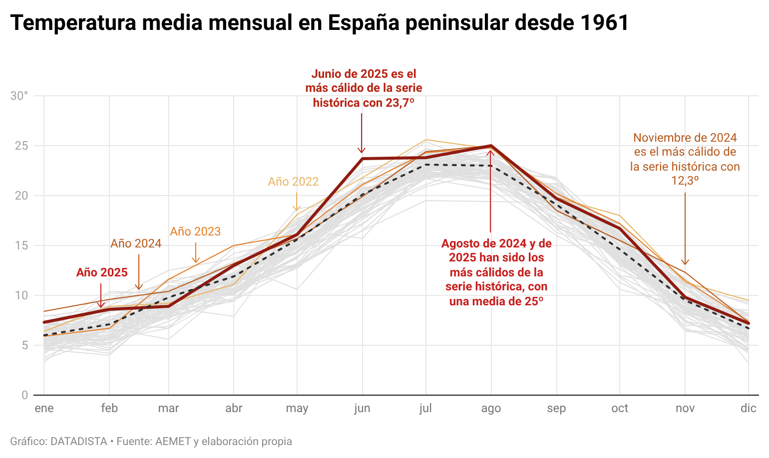 El año 2025 ha sido extremadamente cálido, con una temperatura media en la España peninsular de 15 °C (1,1 °C por encima del promedio), según el balance presentado esta semana por la Agencia Estatal de Meteorología (AEMET). Se sitúa como el tercer año más cálido desde que hay registros (desde 1961), empatado con 2024 y solo por detrás de 2022 y 2023. Los cuatro últimos años han sido los de mayor temperatura media de toda la serie histórica.