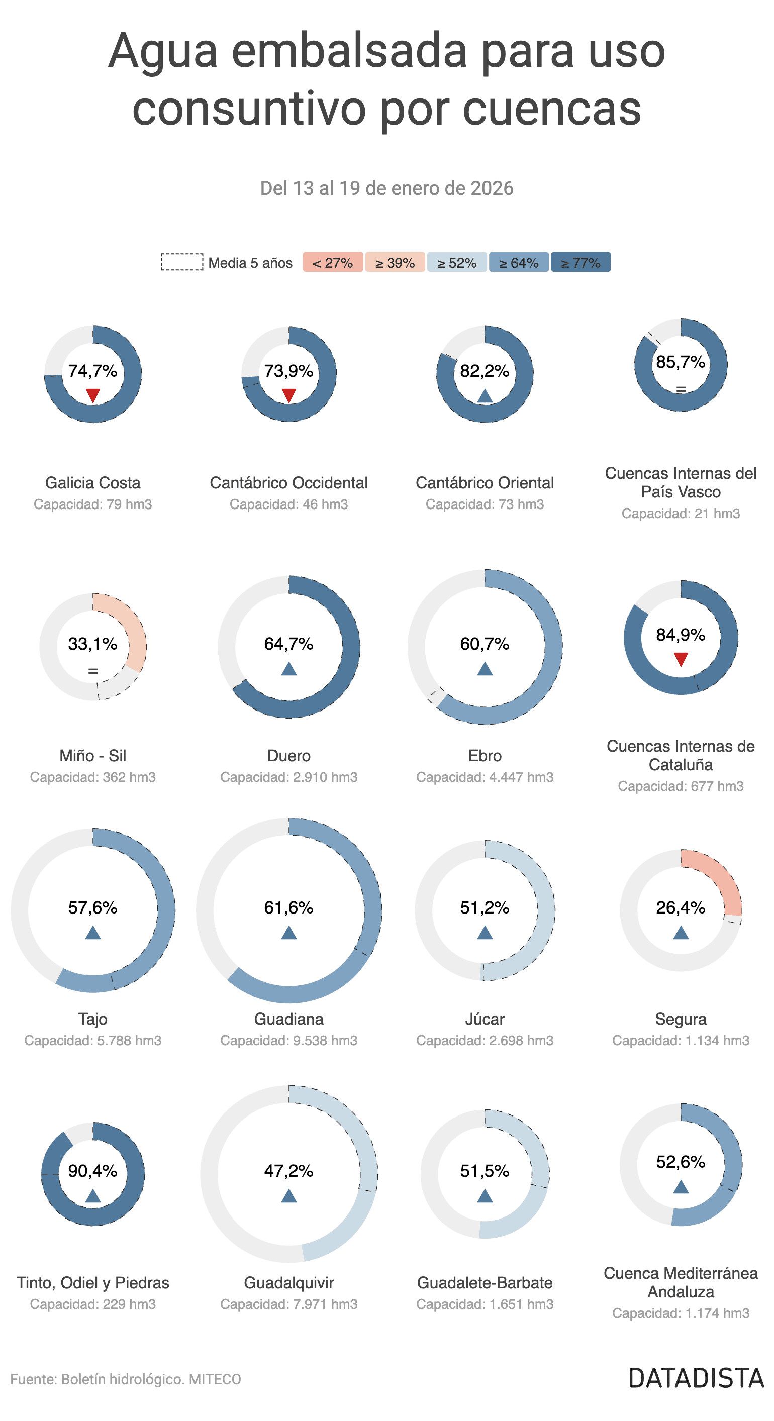 Por cuencas, el descenso más acusado lo protagoniza el Cantábrico Occidental, que retrocede 6,5 puntos hasta caer al 73,9% de su capacidad, seguido por Galicia Costa, que baja 1,3 puntos hasta el 74,7%. En el extremo opuesto destaca el Cantábrico Oriental, que registra la mayor subida de la semana (+4,1 puntos) impulsando sus reservas hasta el 82,2%. En cuanto a las situaciones de mayor escasez, la cuenca del Segura se mantiene a la cola con un 26,4%, seguida por el Guadalquivir, que se encuentra al 47,2%.