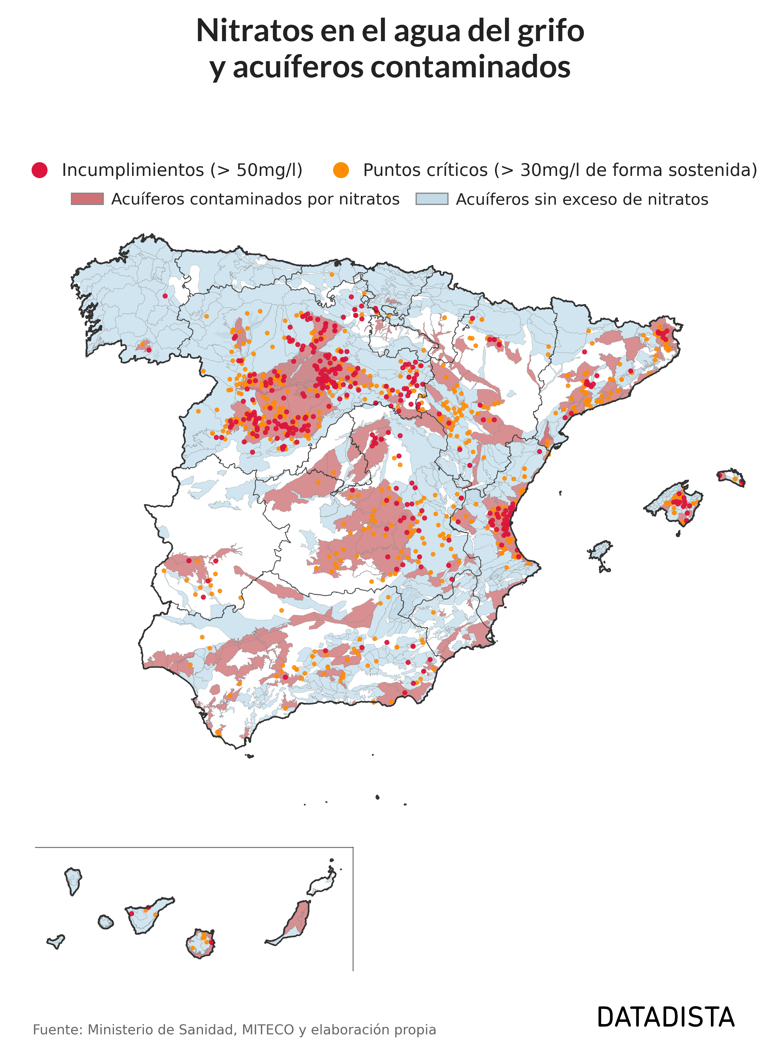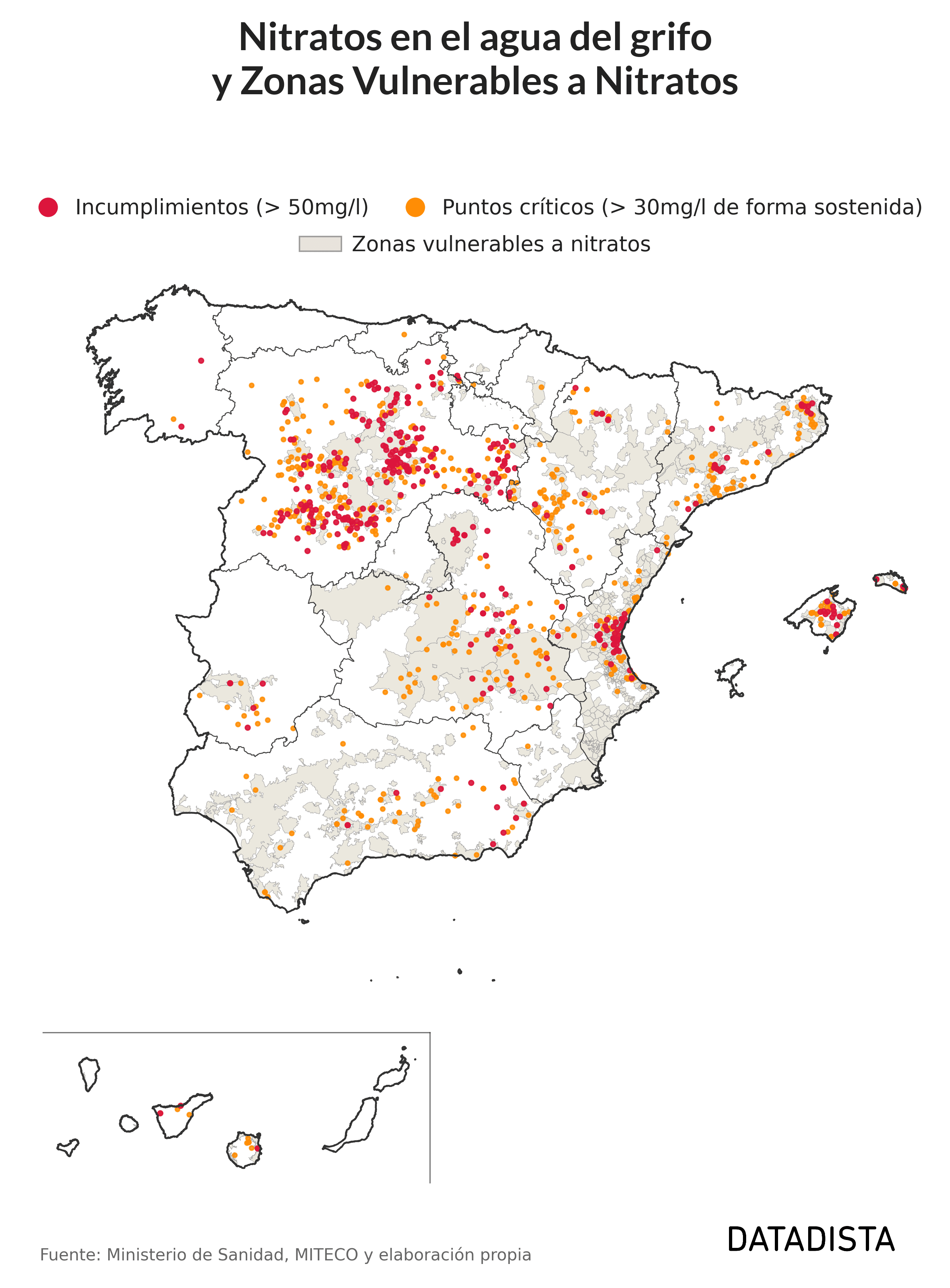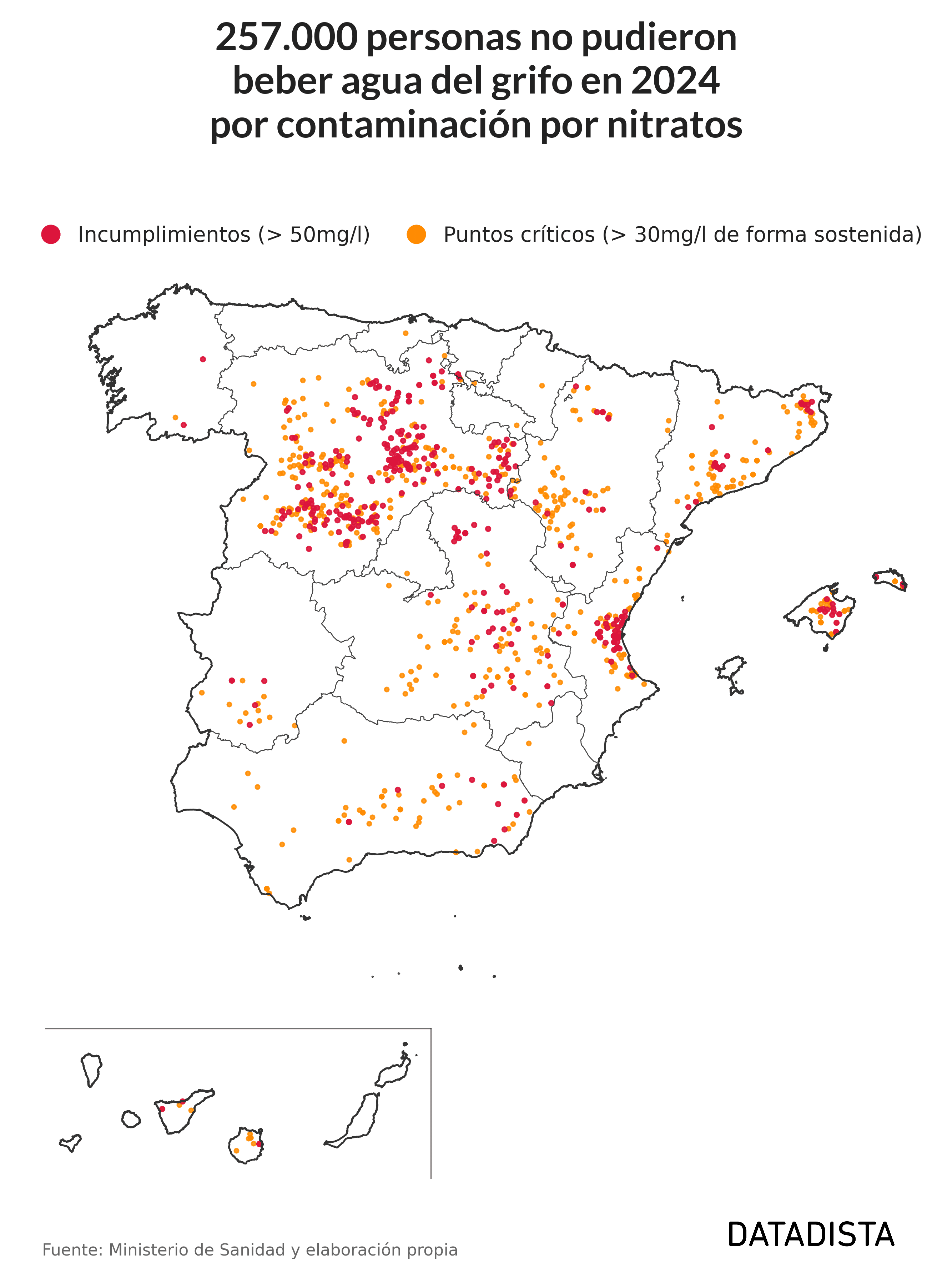 Acabamos de publicar en DATADISTA que el agua del grifo no fue apta para el consumo en 332 municipios de España en 2024 por superar el límite legal de nitratos (50 mg/l). Eso dejó, al menos, a 257.000 personas con avisos de no beber del grifo, según el análisis que hemos realizado a partir del SINAC, la base de datos del Ministerio de Sanidad publicada esta semana.