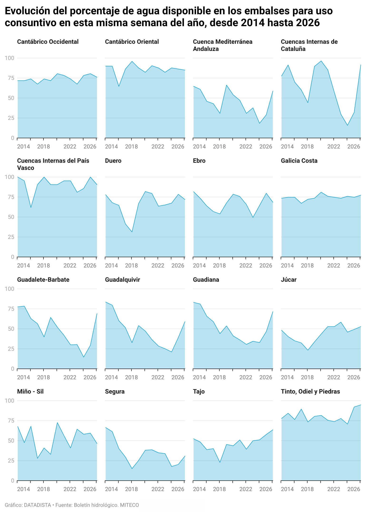 Otro ejercicio que hemos realizado es comparar la evolución por cuencas de los embalses de uso consuntivo para esta misma semana del año entre 2014 y 2026.