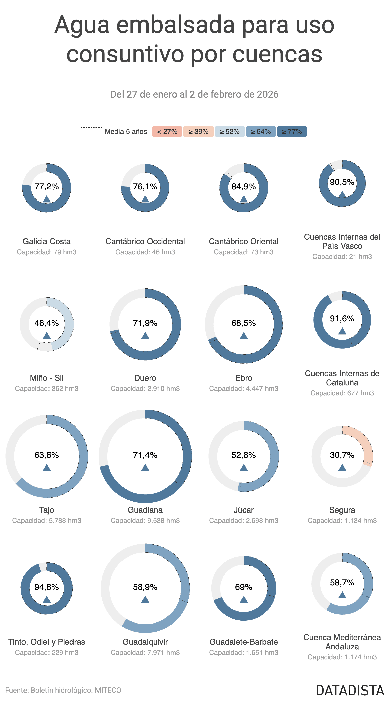 Las Cuencas internas de Cataluña, Guadalete-Barbate, Guadiana, Tajo y Tinto, Odiel y Piedras están mejor que en su media de los últimos 12 años para la misma semana del año. Por otra parte, Miño-Sil, Segura y Cantábrico Oriental están todavía por debajo de esa media histórica.