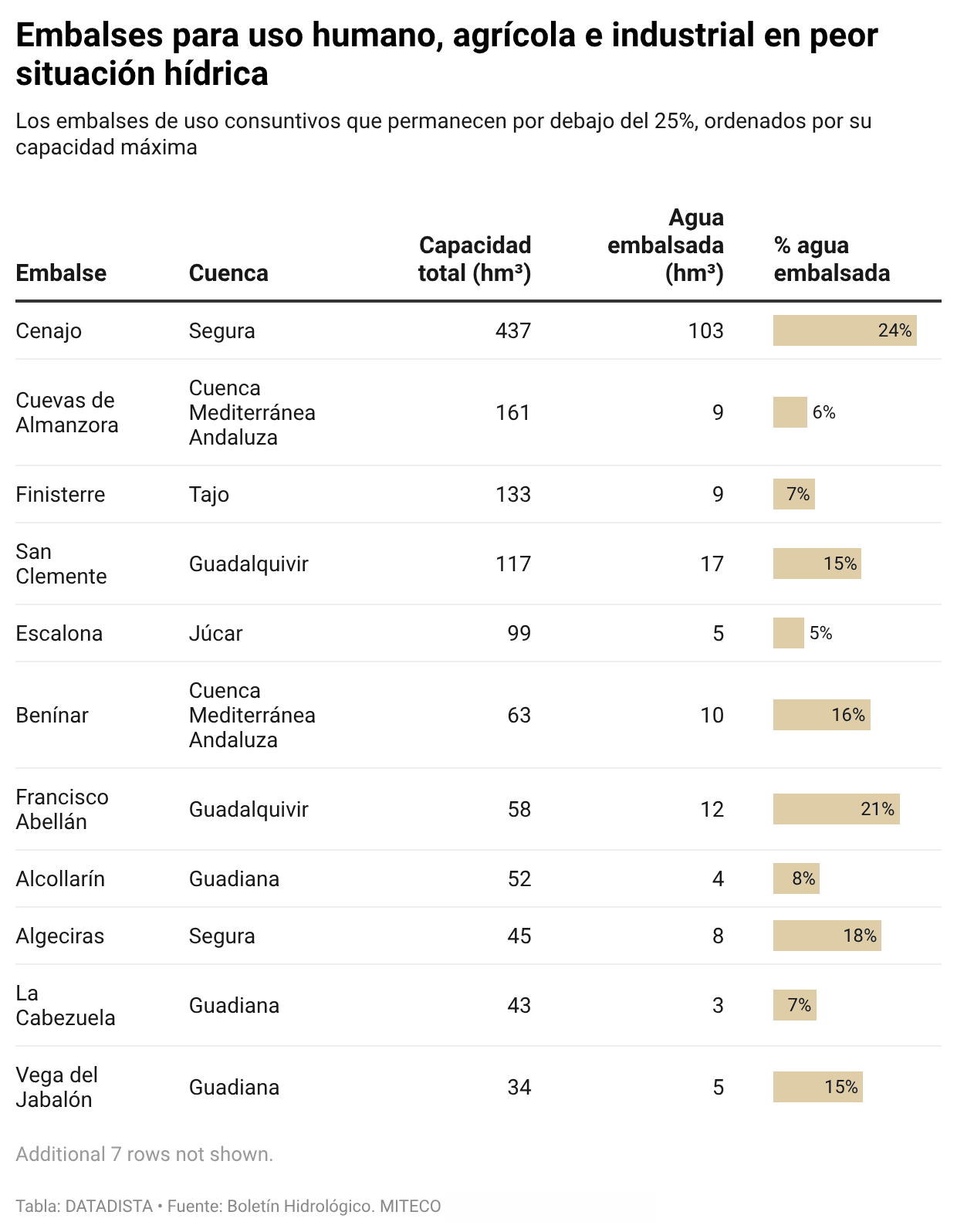 Esta situación de bonanza no es generalizada. Todavía hay 23 embalses de uso humano por debajo del 25% de capacidad. Entre los más grandes en situación crítica destacan el Cenajo (Segura), al 23,57% con 103 hm³, y Cuevas de Almanzora (Cuenca Mediterránea Andaluza), al 5,59% con 9 hm³. También presentan niveles bajos San Clemente (Guadalquivir) al 14,53%, Finisterre (Tajo) al 6,77% y Escalona (Júcar) al 5,05%.
