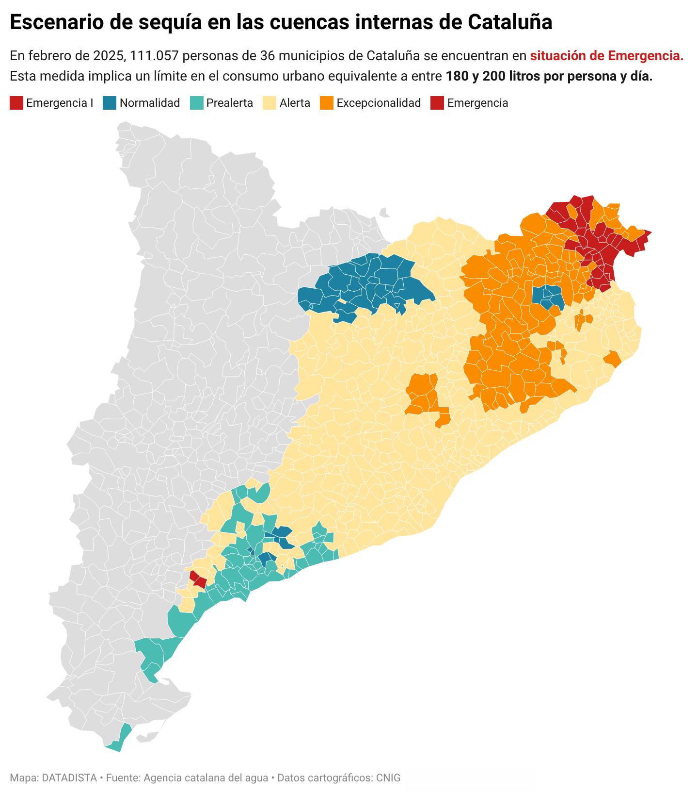 En este gráfico puedes ver el escenario de sequía en la que se encontraban. 111.000 personas en 36 municipios se encontraban en situación de Emergencia en febrero de 2025.