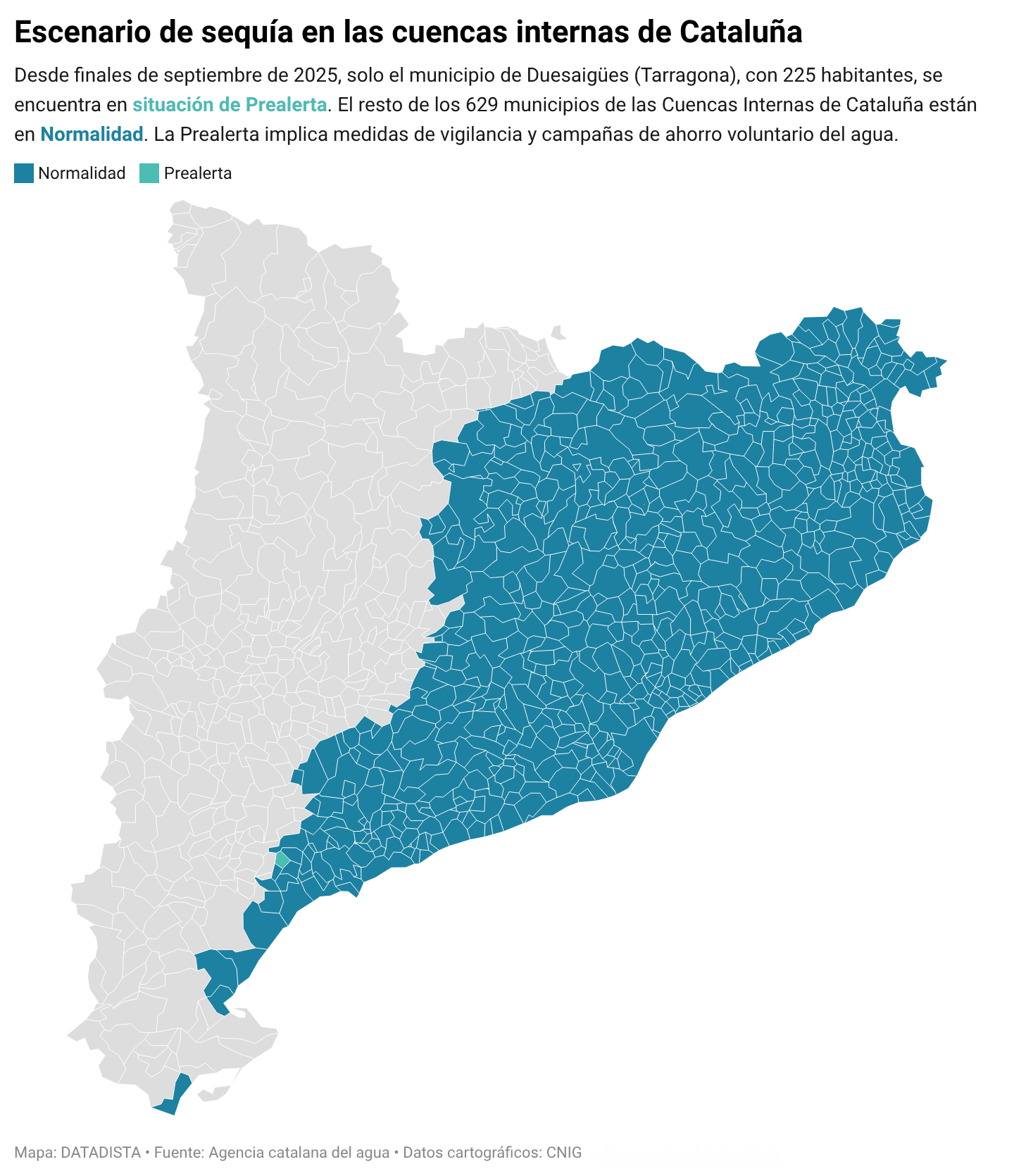 Y este es el escenario actual, desde finales de septiembre de 2025, solo un municipio se encuentra en situación de prealerta, según los últimos datos publicados por la Agencia Catalana del Agua.