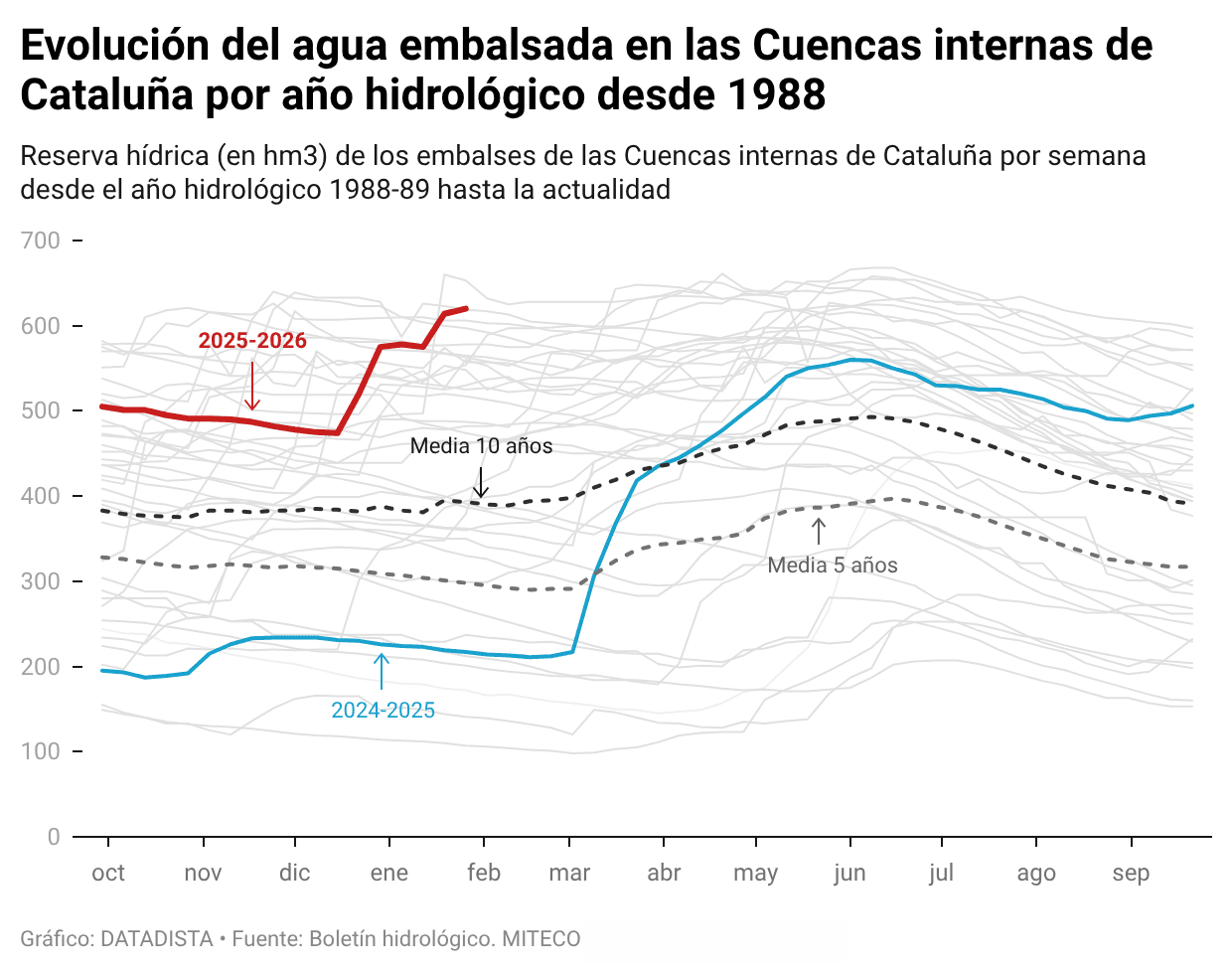 Esta semana nos queremos fijar en la situación de los embalses peninsulares después del paso de un tren de borrascas. Empezamos el año 2026 con Francis encima y llegó Goretti, que dejó paso a Harry antes de la llegada de Ingrid, que precedió a Joseph, para después venir Kristin, visitarnos Leonardo y finalmente Marta. Seguro que has visto muchas imágenes impactantes de ríos desbordados, acuíferos reventando por las paredes de las casas y gente desplazada. Nosotros, que como sabes monitorizamos desde hace años el estado de los embalses, hoy te traemos la información de unas reservas en niveles no vistos desde hace años tras una de las más duras sequías. Tienes toda la información en nuestro panel interactivo de agua Infoagua, cuenca por cuenca.