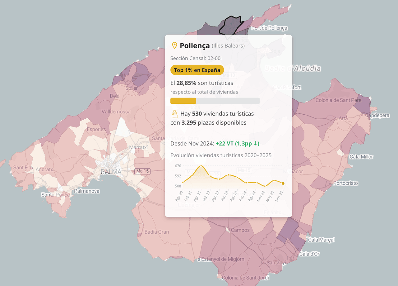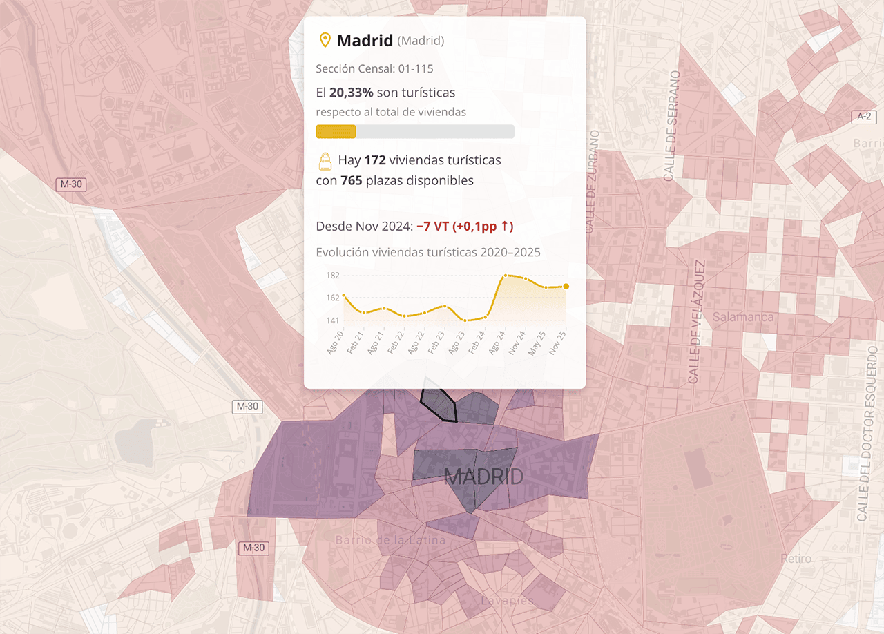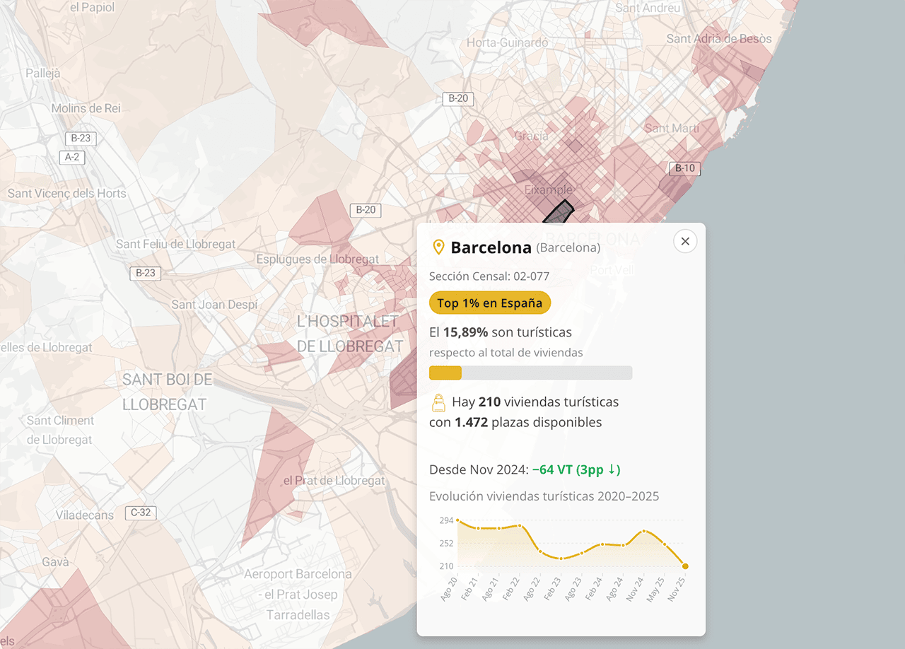 Como te he hemos contado al principio, también hemos aprovechado la actualización de los datos para añadir nuevas funcionalidades al mapa interactivo: ahora puedes ver la evolución de cada sección censal, compararla con el resto del país o, al geolocalizarte, saber cuántas viviendas turísticas te rodean, entre otras novedades.