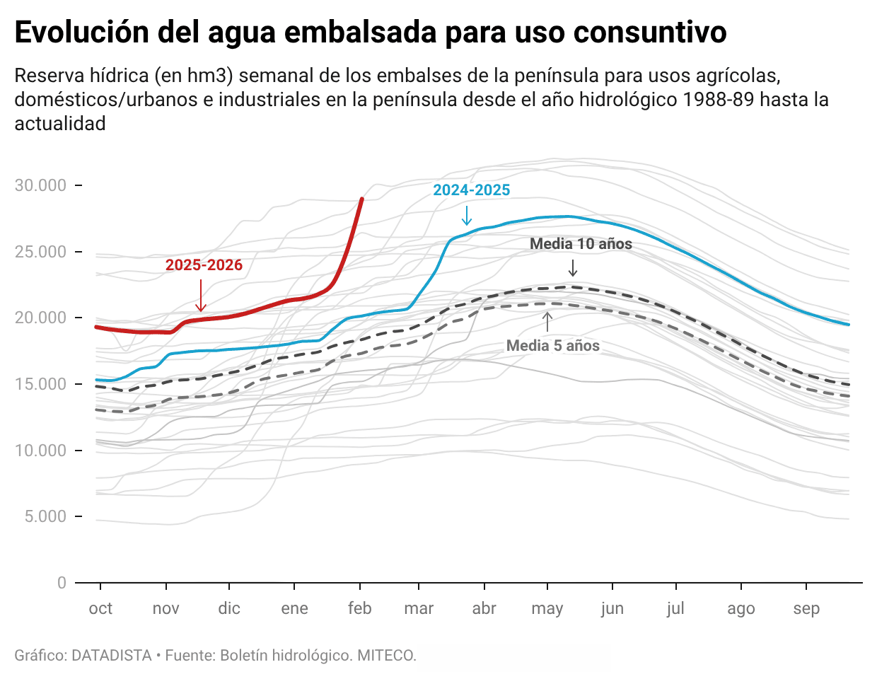 Esta semana, los embalses para uso humano, agrícola e industrial se sitúan en el 74,7% de su capacidad, con un volumen de 28.977 hm³. En la última semana, el agua disponible ha aumentado 3.870 hm³, lo que equivale a una subida de 10 puntos respecto a la semana anterior. Se trata de la mayor subida semanal en los embalses consuntivos de toda la serie histórica, que arranca en 1988. Este volumen se sitúa 29,9 puntos por encima de la media de los últimos cinco años y 22,8 puntos por encima de la misma semana de 2025.