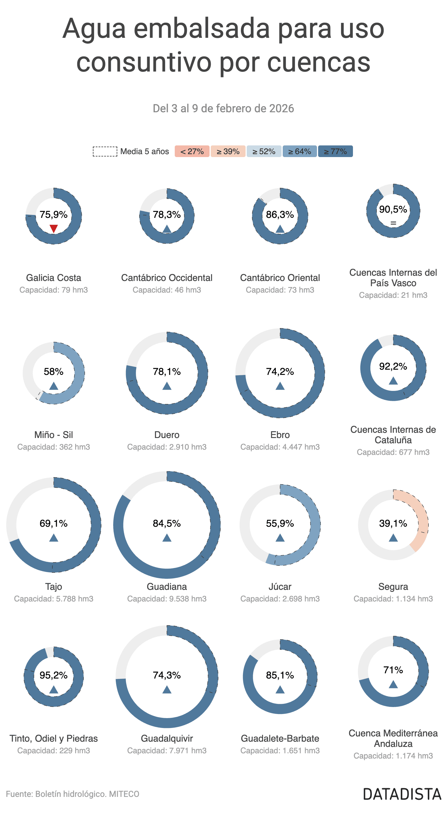 A nivel de cuencas hidrográficas, esta semana solo Galicia Costa baja ligeramente (-1,3 puntos). Las mayores subidas las registran el Guadalquivir (+15,4 puntos, hasta el 74,3%), el Guadiana (+13,1 puntos, hasta el 84,6%), la Cuenca Mediterránea Andaluza (+12,3 puntos, hasta el 71%) y el Segura (+8,3 puntos). También suben con fuerza el Duero (+6,3 puntos, al 78,1%), el Ebro (+5,7 puntos, al 74,2%) y el Tajo (+5,5 puntos, al 69,1%), cuya cuenca alcanza su máximo histórico para esta semana del año.