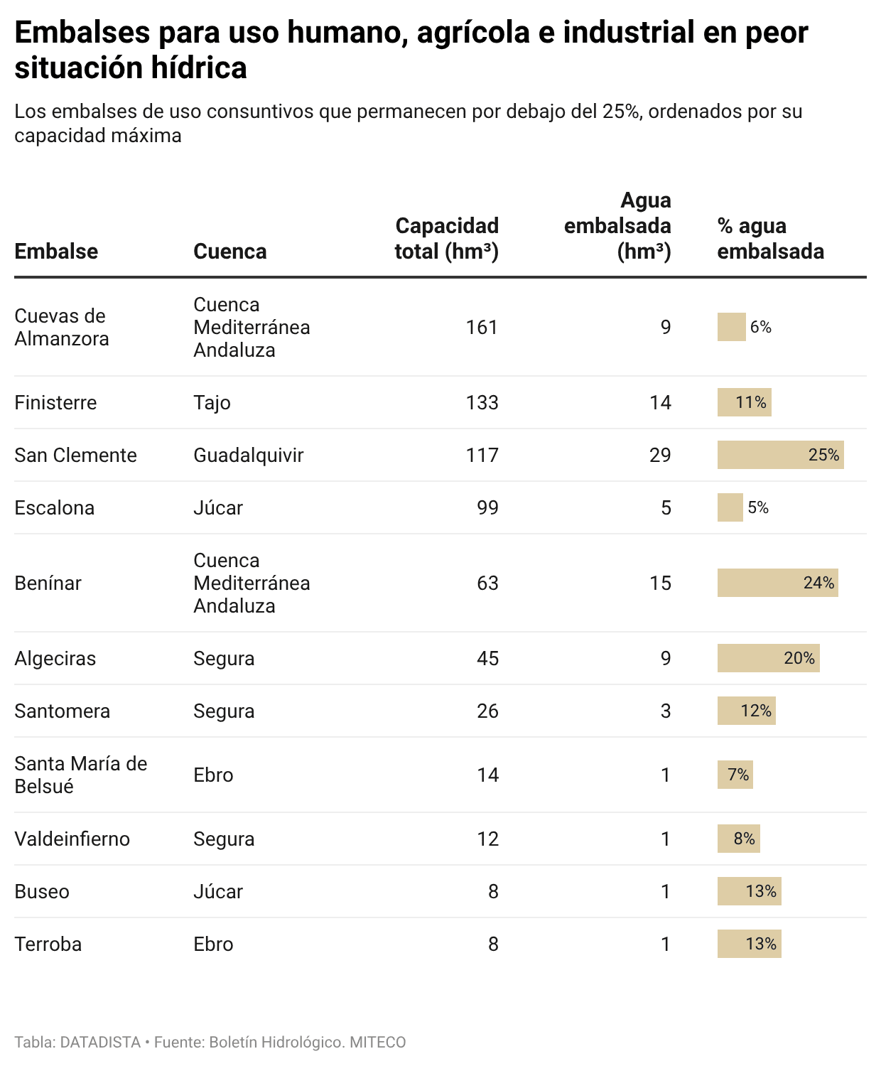 Aun así, hay 12 embalses de uso humano por debajo del 25%, la mitad que la semana anterior. Los de mayor capacidad en esa situación son Cuevas de Almanzora (Cuenca Mediterránea Andaluza) 5,6%, Finisterre (Tajo) 10,5% y Escalona (Júcar) 5,1%. En el Segura hay tres por debajo del 25%: Algeciras 20%, Santomera 11,5% y Valdeinfierno 8,3%.