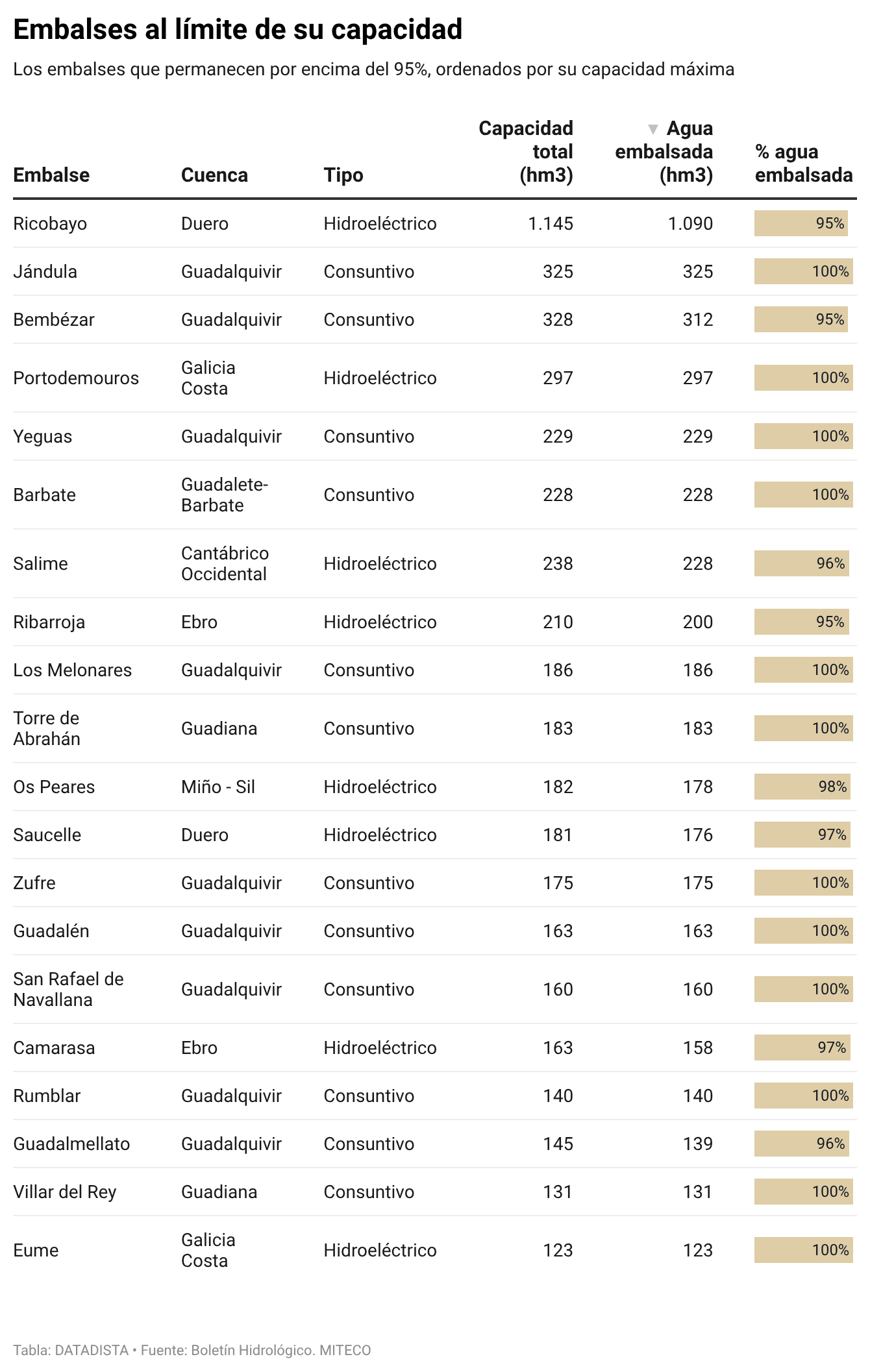 Las lluvias siguen impulsando hitos históricos en los embalses consuntivos. 61 embalses se encuentran al 100% y 20 por encima del 95% de su capacidad. Lo que implica que, para mantener la seguridad, algunos ya están aliviando agua de forma preventiva y emitiendo avisos por aumento de caudales aguas abajo, por ejemplo el embalse de La Baells en el Llobregat, La Cuerda del Pozo en el Duero, o los de La Peña, Yesa y Barasona en el Ebro.