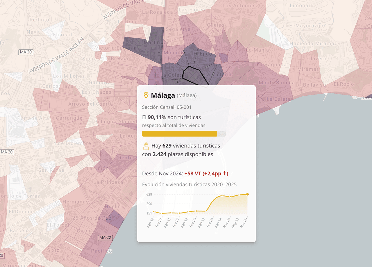 La ciudad de Málaga sigue siendo un ejemplo extremo de la presión de los pisos turísticos. En noviembre de 2024, en unas calles, 8 de cada 10 viviendas eran turísticas. Un año después ha aumentado y ya son 9 de cada 10 viviendas. Hay 58 nuevos pisos turísticos. Lo puedes ver en esta imagen del mapa interactivo.