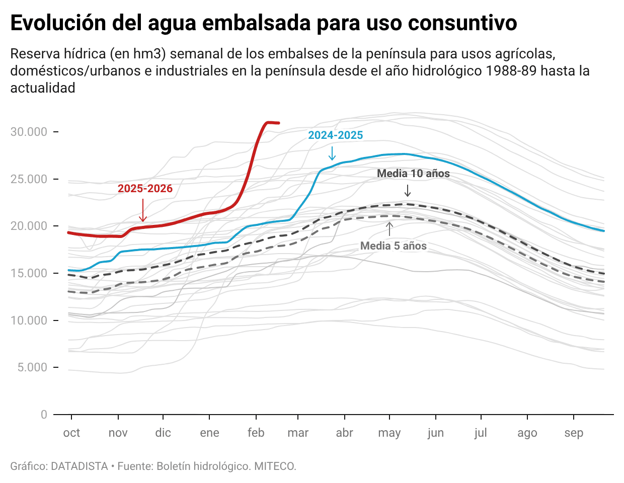 Los embalses mantienen su máximo histórico para esta semana del año y para un mes de febrero en la serie que arranca en 1988.