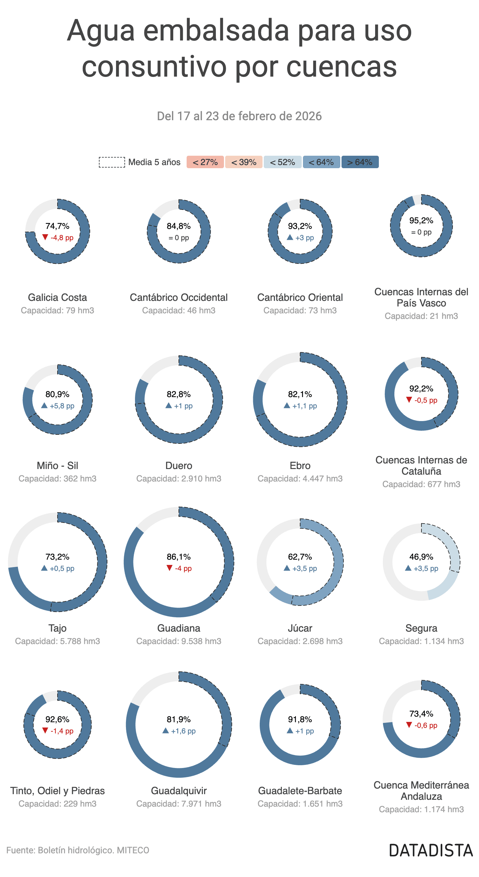 Esta semana bajan cinco cuencas: Galicia Costa (-3,8 puntos, hasta el 74,7%), Guadiana (-3,6 puntos, hasta el 86,1%), Tinto, Odiel y Piedras (-1,3 puntos, hasta el 92,6%), Cuencas Internas de Cataluña (-0,4 puntos, hasta el 92,2%) y Cuenca Mediterránea Andaluza (-0,4 puntos, hasta el 73,4%).