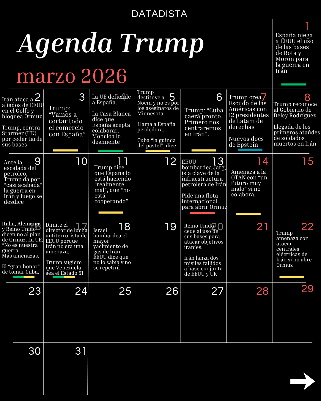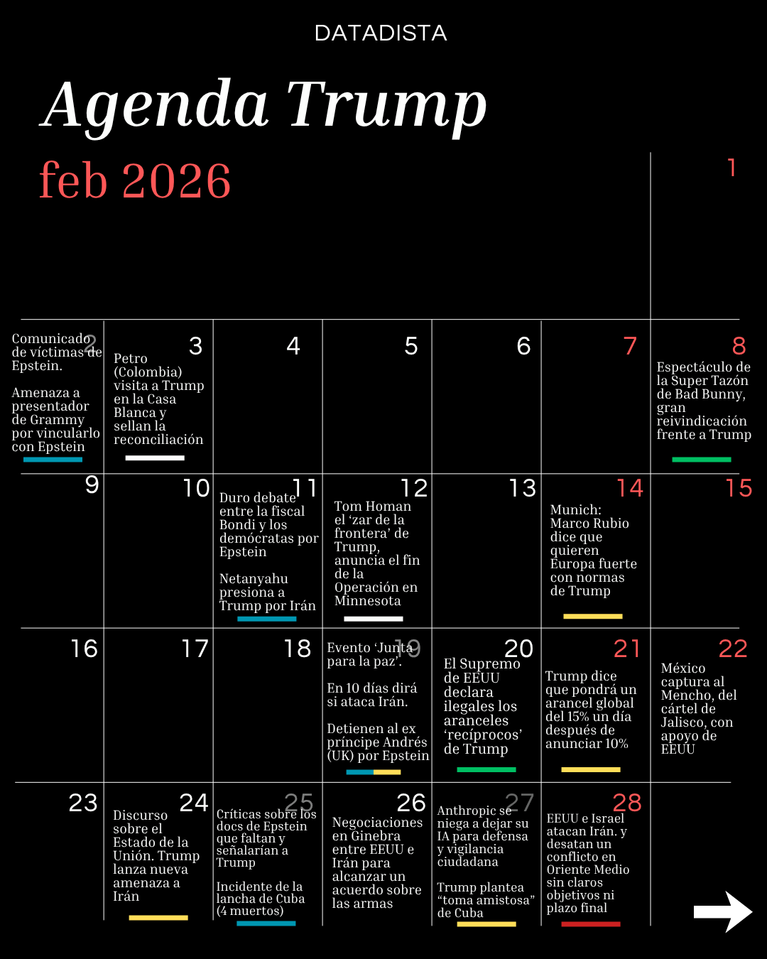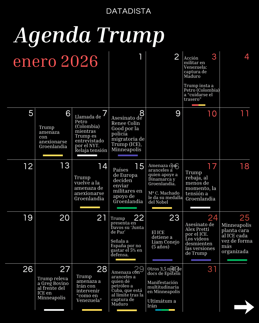 En la agenda hemos puesto una línea amarilla en los días de amenaza, roja los de ataques o acciones exteriores, morada en las acciones del ICE, azul cuando ha habido novedades sobre el caso Epstein, verde cuando algo le ha plantado cara a Trump y blanco cuando podríamos estar ante un momento TACO, es decir, cuando Trump ha enfriado o dado marcha atrás en sus amenazas o decisiones. Si echas de menos alguna fecha importante, te pedimos que nos lo hagas saber para ir completando esta agenda frenética que algún día contarán los libros de historia, esperemos que con un final lo menos malo posible.