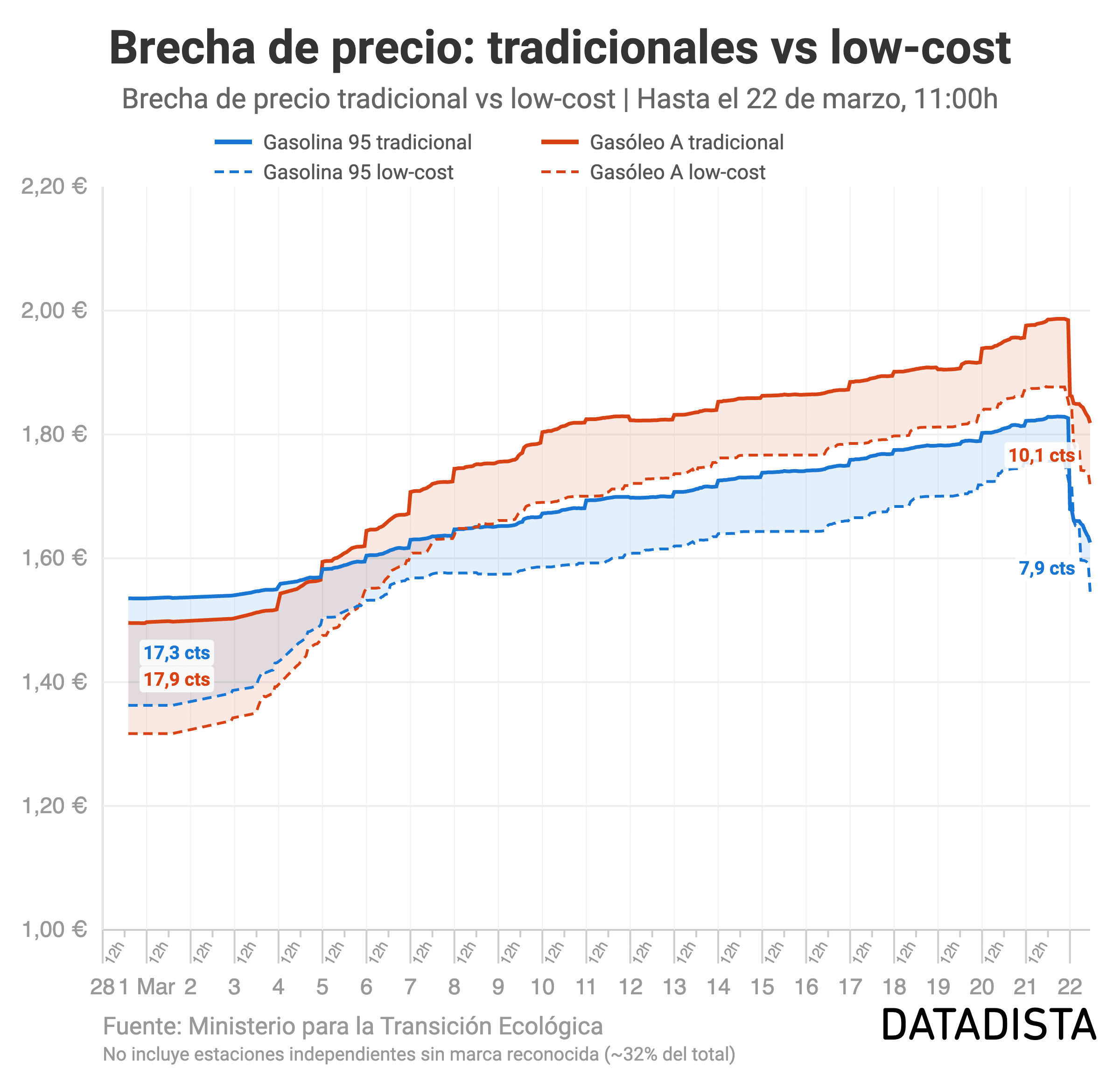 Las gasolineras tradicionales (Repsol, Cepsa, BP, Galp...) han trasladado la bajada con más rapidez: la 95 ha caído 21,2 céntimos de media en estas estaciones, frente a los 19,8 céntimos de las cadenas low-cost (Plenoil, Ballenoil, Petroprix, Bonàrea...). En el diésel, la diferencia es de 17,3 frente a 15,1 céntimos.