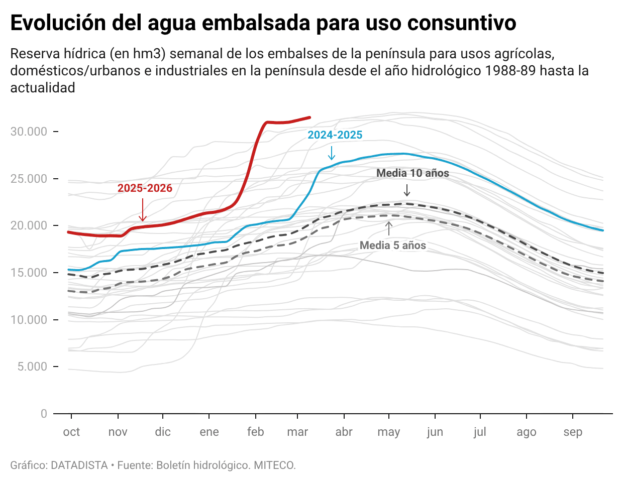 El agua embalsada para uso humano, agrícola e industrial está esta semana al 81% de su capacidad. Con 31.505 hectómetros cúbicos, estamos ante el máximo histórico para esta semana del año en los 39 años de serie.