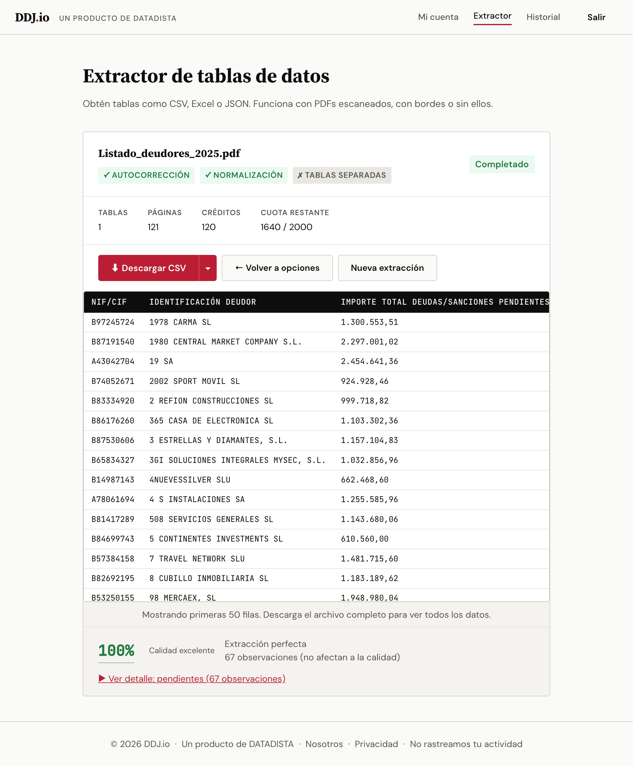 Sabemos lo frustrante que es pelearse con un PDF para extraer datos; de hecho, es la tarea a la que más tiempo hemos dedicado en nuestras investigaciones. Por ejemplo, extraer y normalizar la famosa lista de morosos que publica Hacienda cada año nos llevaba hasta cuatro horas de trabajo para conseguir un archivo CSV que pudiéramos analizar. Hoy, gracias a la herramienta que te presentamos, lo tenemos listo en menos de un minuto.
