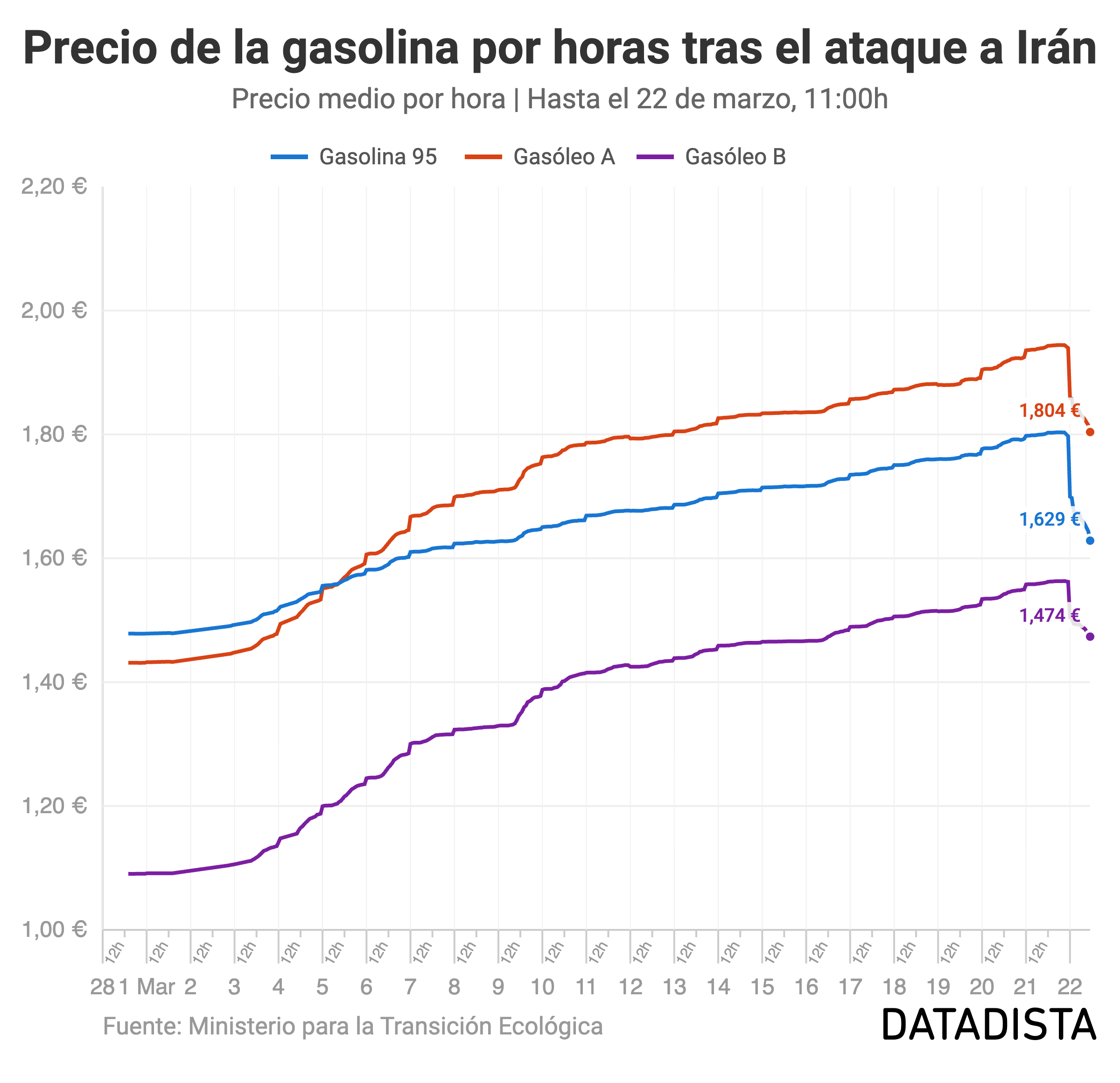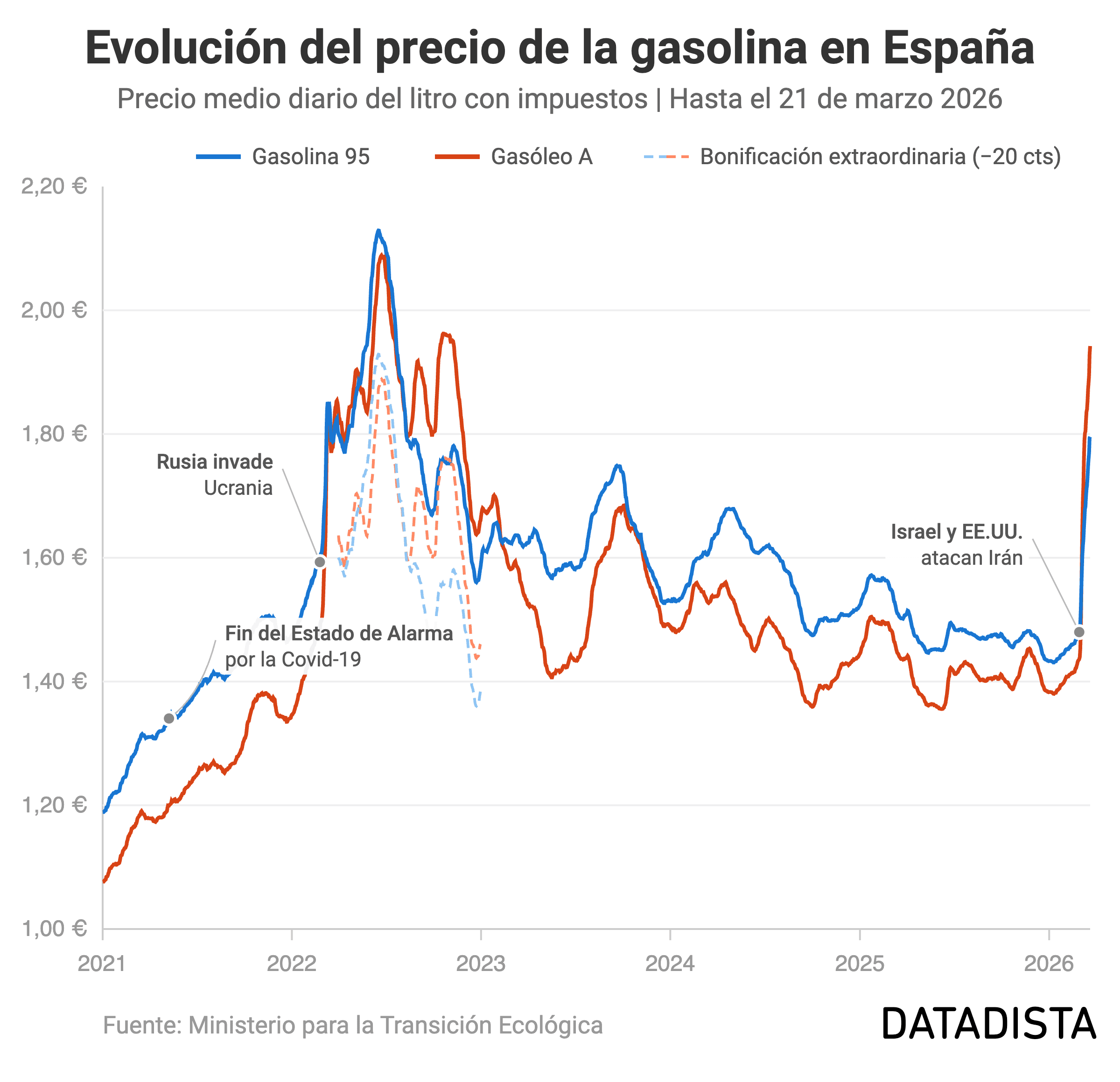 En este gráfico puedes ver la evolución del precio de la gasolina desde 2021. El objetivo es que puedas comparar el impacto que está teniendo el ataque a Irán respecto a los primeros momentos de la invasión de Ucrania por parte de Rusia.