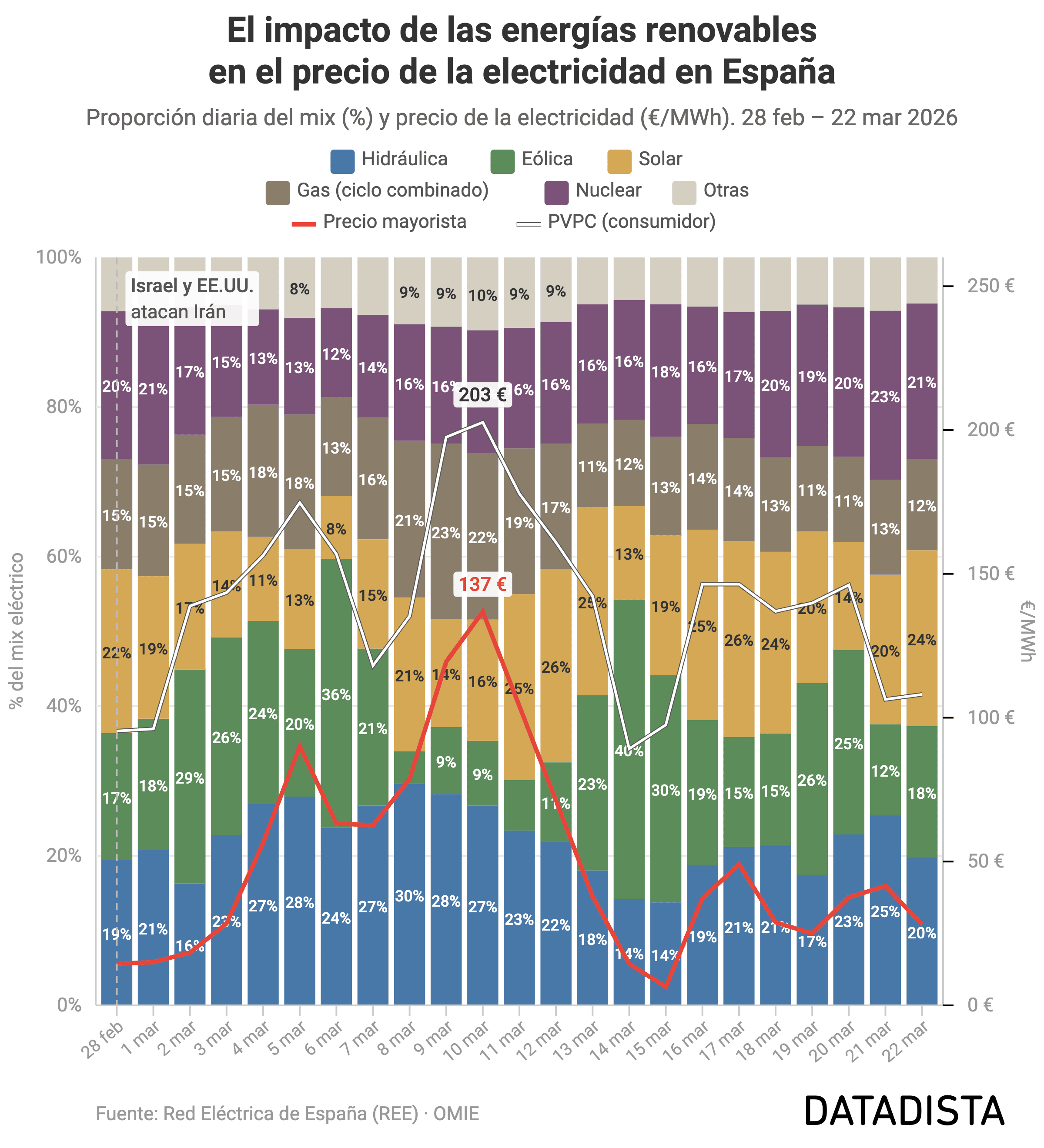 Como puedes ver en el siguiente gráfico, el problema aparece cuando las renovables no son suficientes y tiene que entrar en juego el ciclo combinado, que quema gas, como ocurrió entre el 8 y el 12 de marzo, donde la falta de viento hizo que tuviera más peso el ciclo combinado.