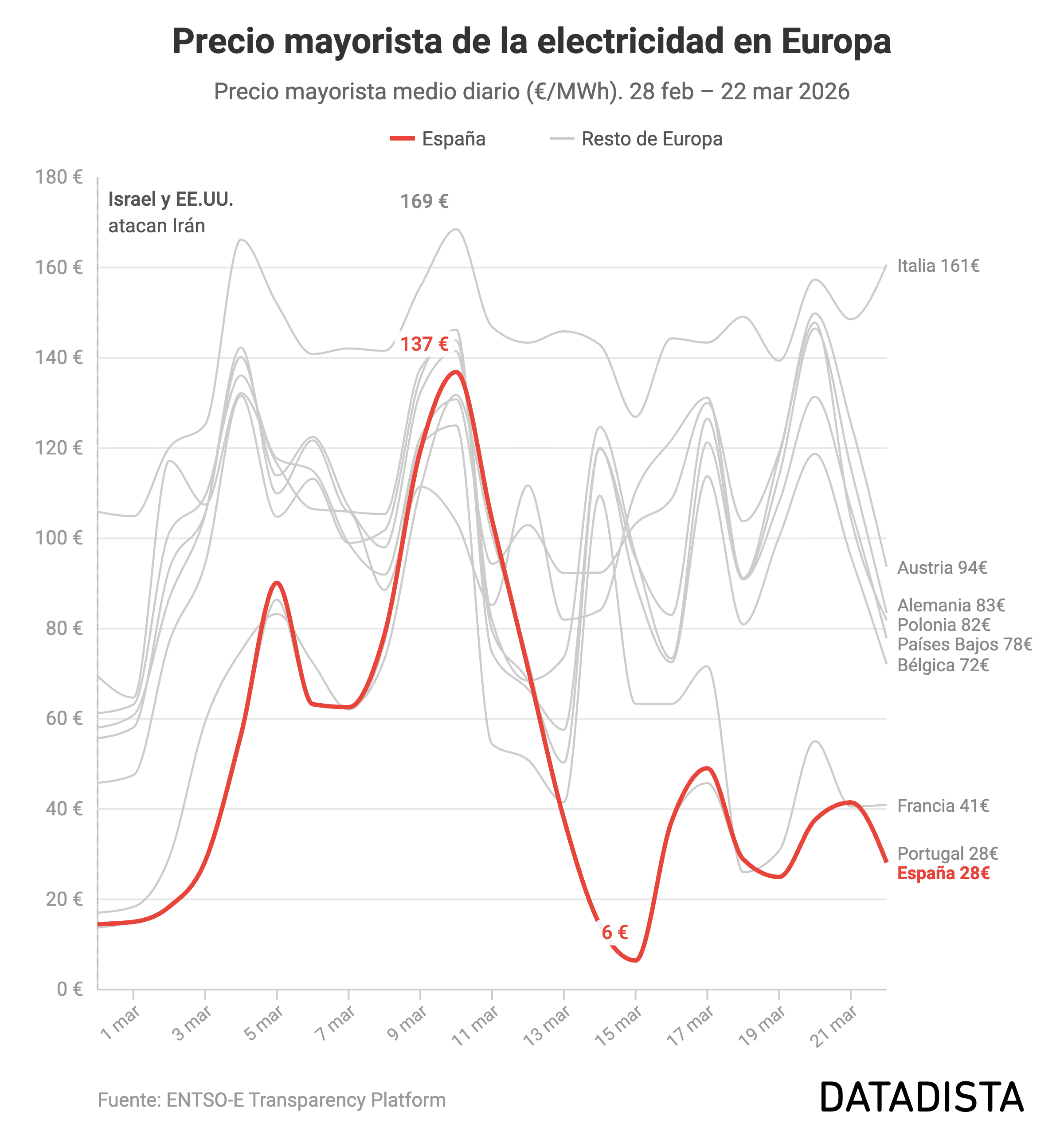 Por otro lado, los datos muestran que España cuenta con una ventaja competitiva muy clara frente al resto de Europa gracias a nuestras renovables. Mientras que en la última semana países como Italia han pagado de media casi 149 euros por megavatio hora y Alemania ha superado los 108 euros, en España el precio medio del mercado ha bajado hasta los 35 euros. Esta diferencia se explica por la eólica y la solar: en las horas de mayor producción renovable, el precio del mercado mayorista cae drásticamente. De hecho, en las horas centrales de este domingo, el valor de la energía en el mercado ha llegado a ser de cero.
