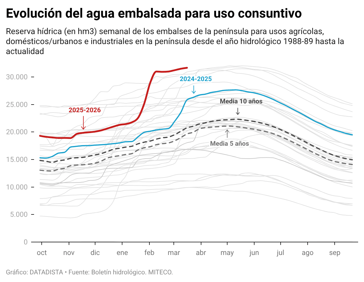 El agua embalsada para uso humano, agrícola e industrial ha vuelto a marcar récord esta semana: 81,7% de capacidad, con 31.683 hectómetros cúbicos, más de 30 puntos por encima de la media del último lustro. El máximo para esta época del año en los 39 años de serie.