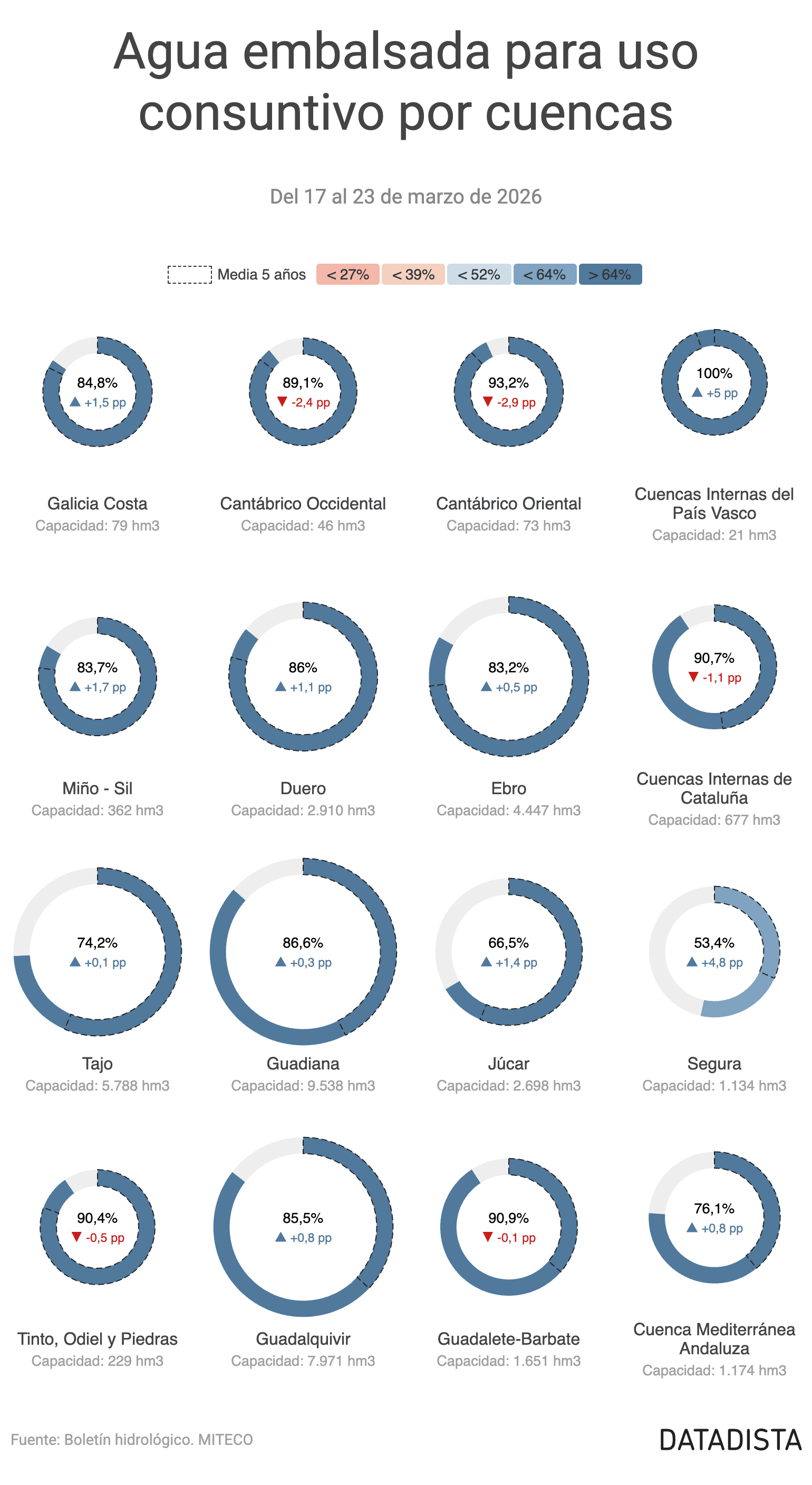 Por cuencas, el Tajo y el Júcar han alcanzado niveles de agua para abastecimiento nunca vistos: 74,2% y 66,5%. Las cuencas que sufrieron la sequía siguen muy por encima de lo habitual: Guadalete-Barbate al 91%, Guadiana al 87% y Guadalquivir al 85%. El Segura, la más rezagada, supera ya el 53%, impulsado por los aportes del trasvase Tajo-Segura.