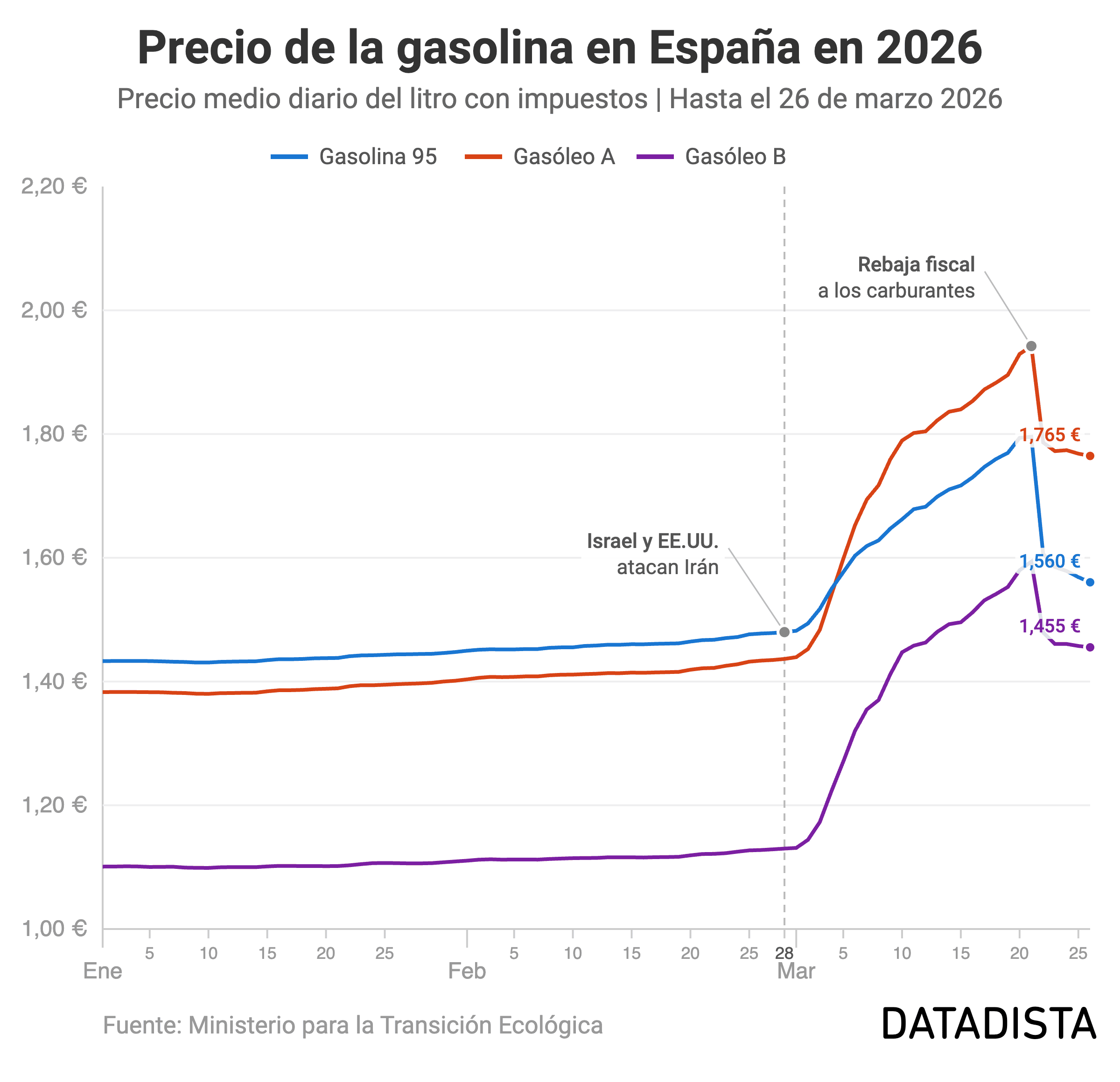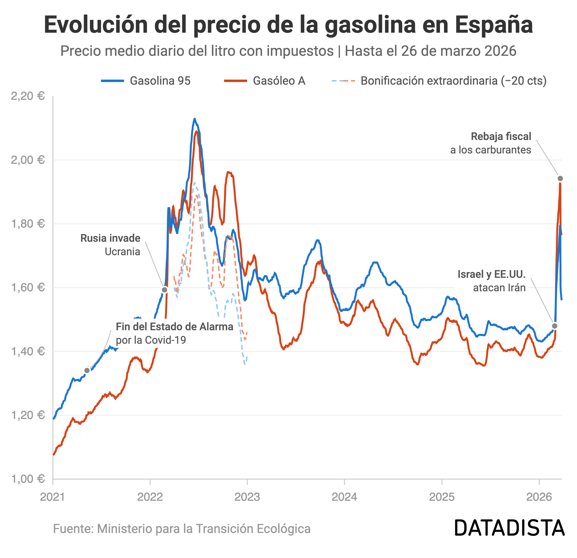 En este gráfico puedes ver la evolución del precio de los carburantes desde 2021 y comparar el impacto de esta rebaja con otros momentos críticos, como el inicio de la guerra de Ucrania o el ataque a Irán.