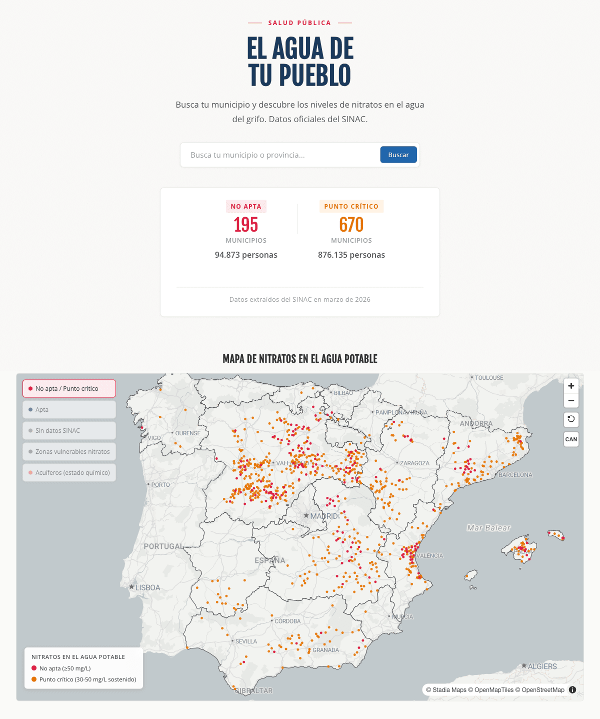 Hoy por fin te traemos algo que lleváis pidiéndonos años. Es literal. Y te podemos asegurar que es un orgullo para nosotros tenerlo listo al fin. Cada vez que hemos publicado los datos, mapas e investigaciones con los municipios que no tienen agua potable en las casas debido a la contaminación por nitratos, nos habéis repetido lo mismo: para cuándo un mapa que permita buscar por municipio, comprobar el agua en el pueblo al que vamos de vacaciones, en el que vivimos, donde viven nuestros padres. Nuestro empeño en informar con datos y sobre el terreno sobre los municipios de España que han perdido el derecho al agua potable incluso nos hizo ganar el Premio Rey de España de Periodismo Medioambiental 2025 con Veneno en el grifo: ruta por la España sin derecho al agua potable. Pero teníamos que conseguir lo que nos pedíais. Hoy se hace realidad.