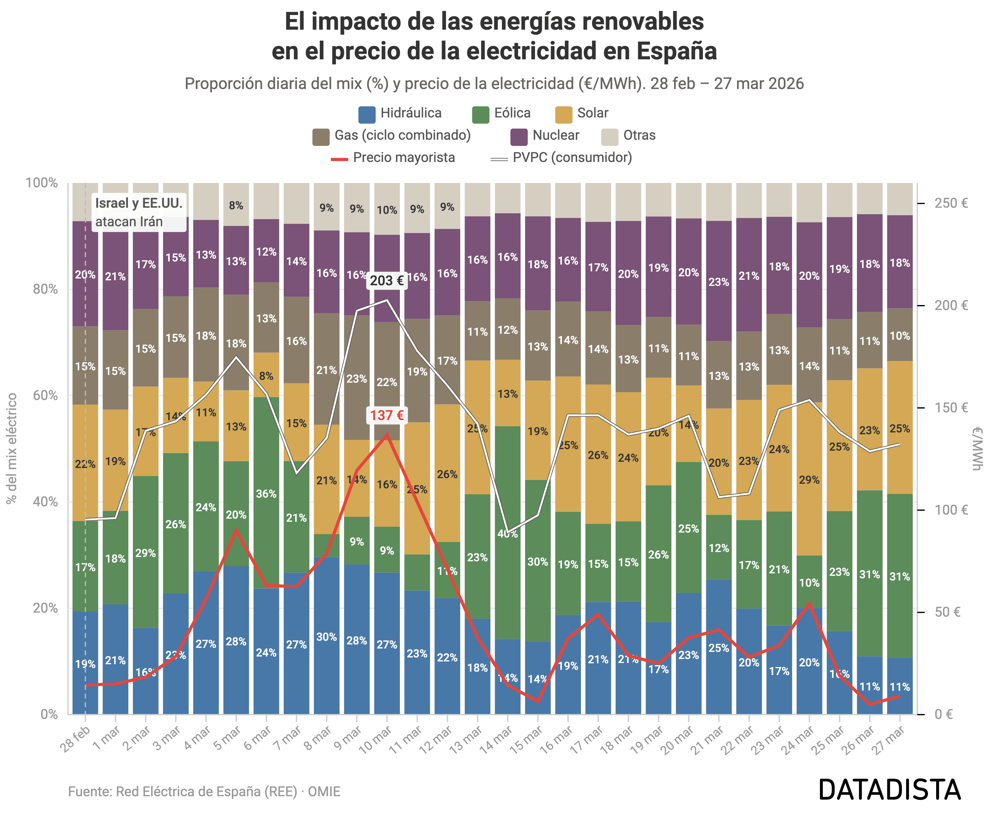 La clave está en el mix. La eólica y la solar han ido ganando peso hasta representar el 56% de la generación el jueves, empujando al gas a apenas un 10%. El contraste dentro de la propia semana lo dice todo: el martes, con menos viento (12%) y más gas (13%), el precio estaba en 41 euros. Tres días después, con la eólica triplicando su peso, cayó a 5.