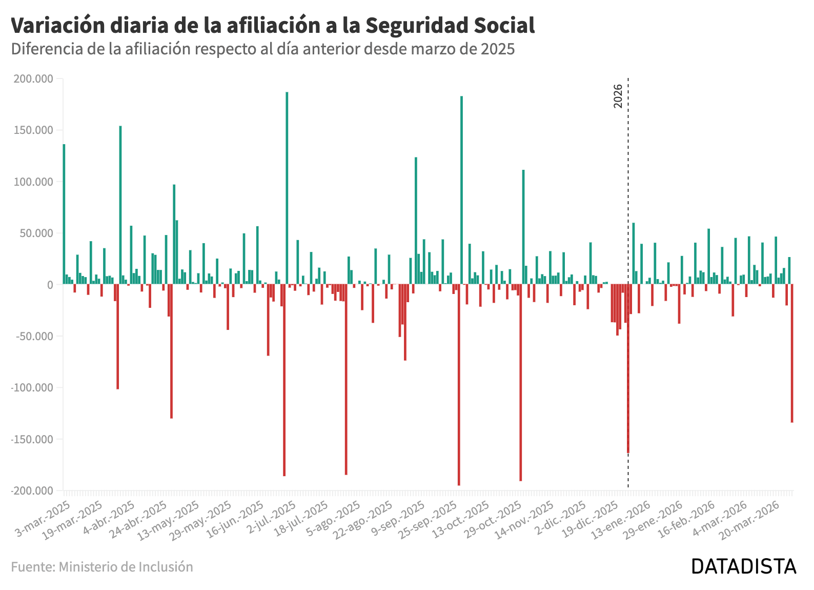¿Cómo es posible que siga siendo habitual este gráfico de variación diaria de la afiliación? Lo que ves son los aumentos en lunes, caídas en viernes y, en las líneas más pronunciadas, el principio y final de cada mes. Cuando se acumulan días de bajas o altas es porque estamos ante un final de temporada alta en algún sector (verano, Navidad, rebajas, campaña agrícola...).
