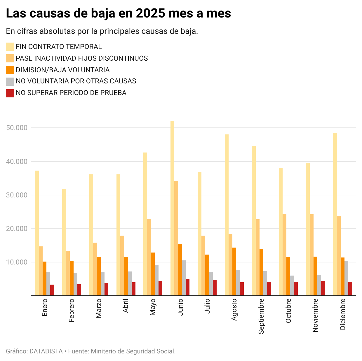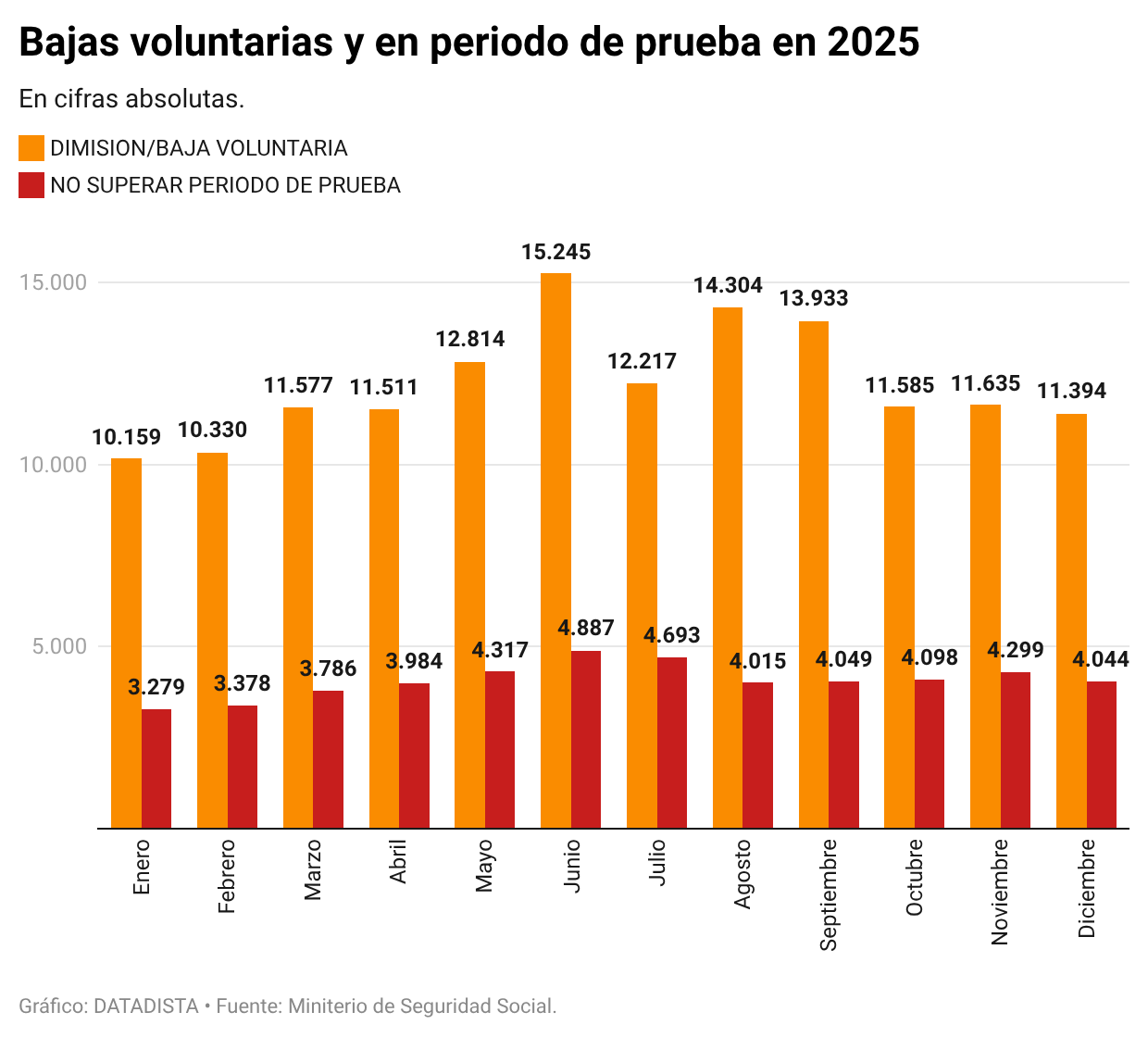 Lo que no cuadra es que sea en meses afectados por la estacionalidad cuando a los trabajadores y trabajadoras les dé por acogerse de forma voluntaria a una baja (un 50% más en junio respecto a enero de 2025, por ejemplo) y que en esos meses sea también cuando se da de baja a más personas por no haber superado el periodo de prueba. Lo vemos en el siguiente gráfico con datos absolutos de estas dos causas de baja.